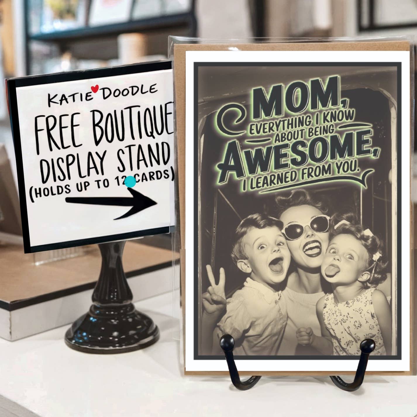 À PROPOS DE KATIE DOODLE Fondée par Jamie en 2012, la marque a commencé avec des impressions personnalisées pour sa fille, Kate, et a rapidement gagné en popularité alors que ses amis et sa famille recherchaient des designs sur mesure. Avec plus de 1 500 magasins de cadeaux et boutiques à travers les États-Unis et le Canada proposant leurs cartes, Katie Doodle s'est imposée comme un choix de confiance pour les détaillants. La marque soutient également Our Daughters International, une organisation engagée à mettre fin à la traite des êtres humains au Népal et au-delà. Toutes les cartes de vœux de Katie Doodle sont accompagnées d'un présentoir GRATUIT, améliorant leur présentation sur les comptoirs de vente au détail. Ce présentoir élégant en métal noir peut contenir jusqu'à 12 cartes, ce qui en fait un ajout parfait pour les boutiques souhaitant mettre en valeur leur sélection de manière belle et facile ! Katie Doodle offre la livraison gratuite tous les jours sur toutes les commandes.