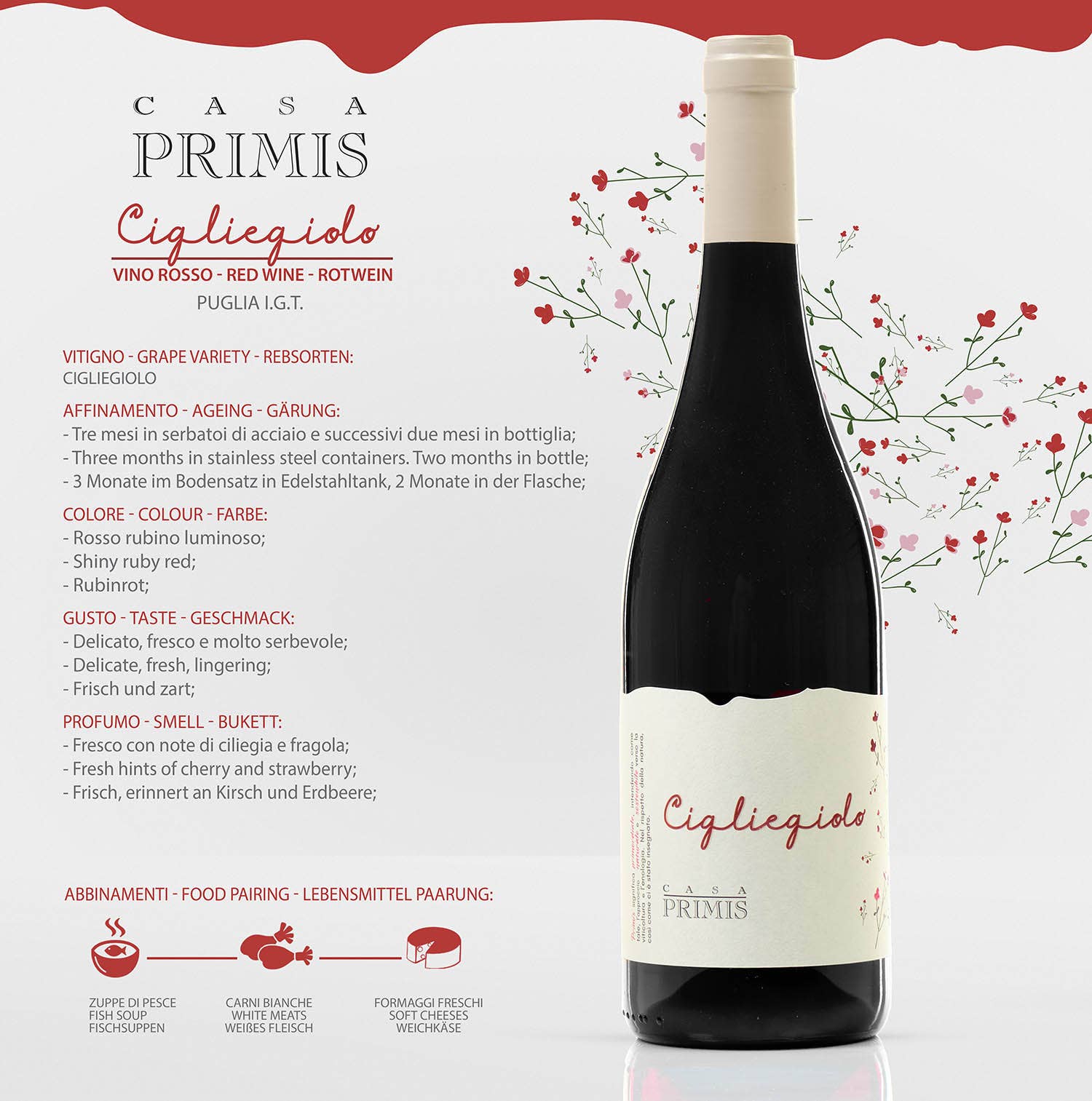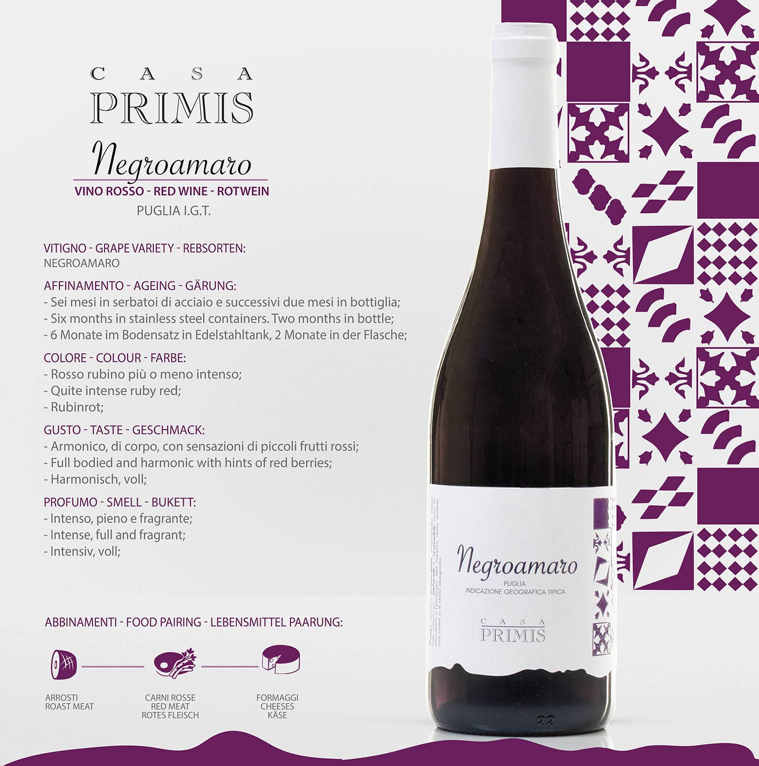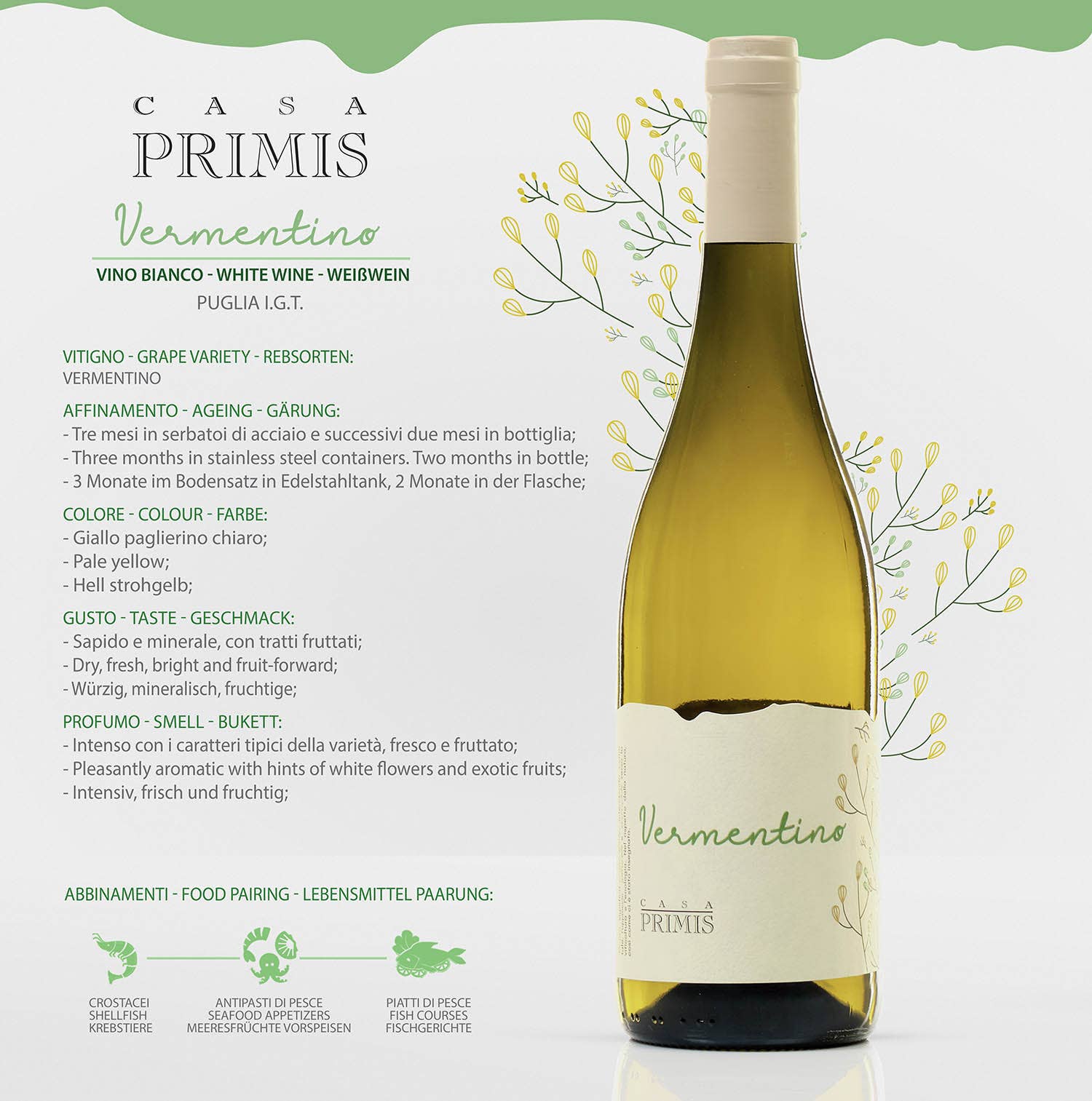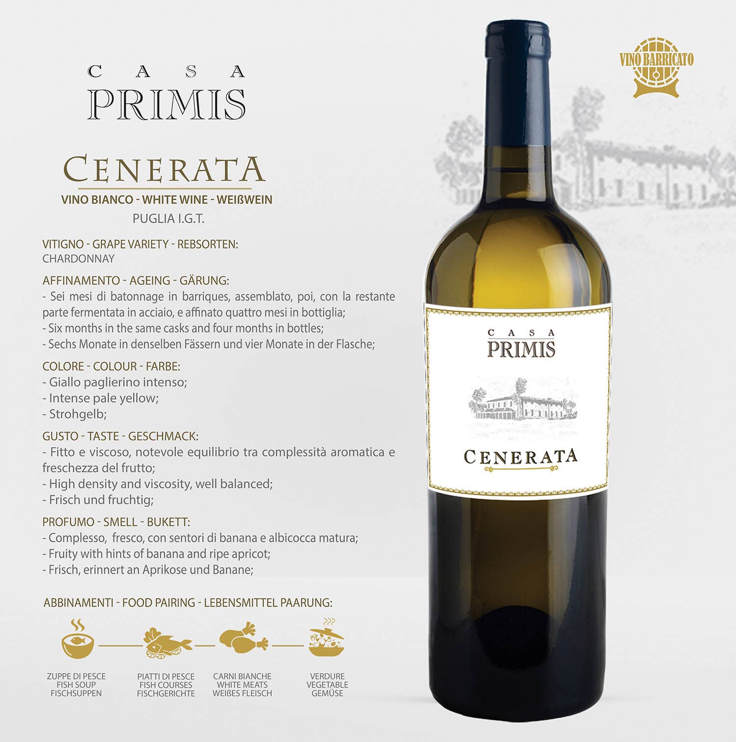CASA PRIMIS a été fondée en 2003 lorsque Gianni Mauriello, 19 ans, technicien en vin, et Nicola Selano, 22 ans, vigneron, ont décidé, profitant du changement de génération dans leurs fermes respectives, de valoriser les raisins produits dans leurs vignobles. Les deux jeunes techniciens ont ainsi mis à profit leurs études, qui se fondent sur l'expérience et la tradition de leurs prédécesseurs, qui ont réalisé au moins 40 récoltes. Les anciennes tentes des Pouilles, qui produisaient des rendements élevés à l'hectare, sont remplacées par des systèmes de dossier, qui mettent l'accent sur la qualité plutôt que sur la quantité. Nero di Troia, Negroamaro, Primitivo, Bombino Bianco, Greco, Fiano, Vermentino et Chardonnay sont implantés. Le travail et la passion restent inchangés du vignoble à la cave, où des équipements technologiques sont utilisés pour produire des vins dans le respect de la tradition des Pouilles. La philosophie de l'entreprise est de valoriser les vignes indigènes en les vinifiant avec pureté afin que chaque vin possède les caractéristiques organoleptiques de la vigne à partir de laquelle il est produit. CASA PRIMIS est attentive à la durabilité environnementale. En plus d'être certifiées BIO, des boîtes en carton recyclé et des bouteilles légères sont utilisées pour l'emballage.