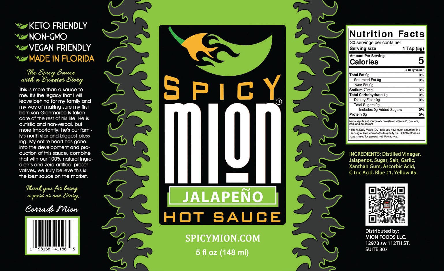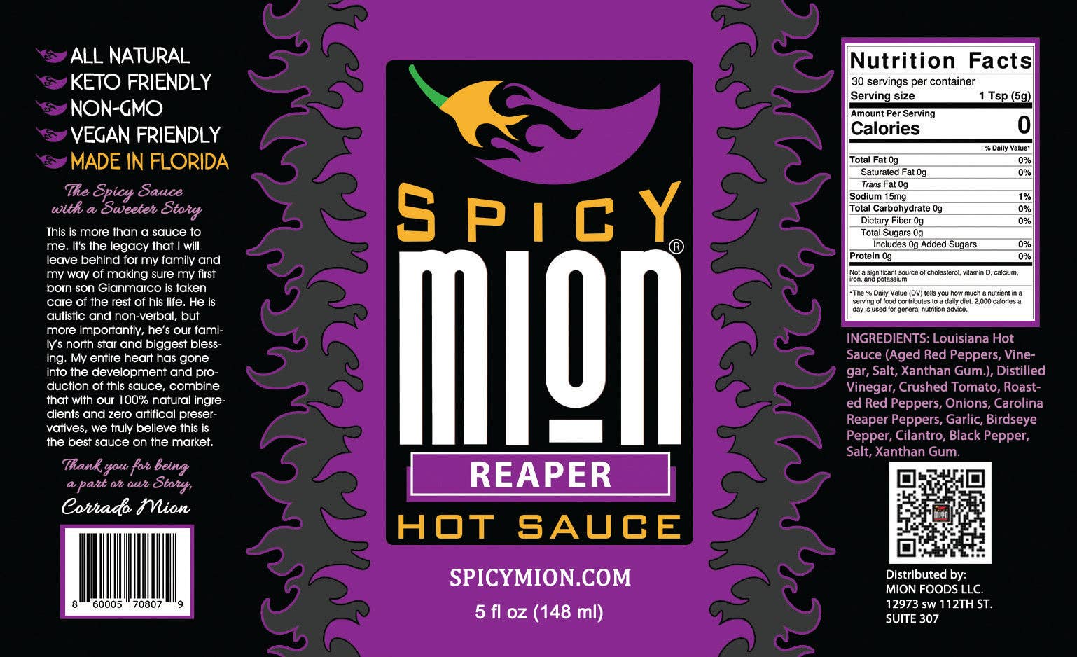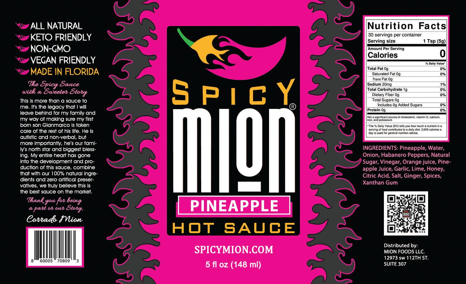 Pendant des années, la sauce piquante Spicy Mion était ma sauce secrète que je partageais uniquement avec ma famille et mes amis. Cette sauce est bien plus qu'un simple condiment, c'est l'héritage que j'ai légué à ma famille et à mon fils Gianmarco. C'est le goût de beaux souvenirs avec mes proches. Avec des ingrédients 100 % naturels et sans agents de conservation ni agents de remplissage artificiels, je vous présente la sauce piquante épicée au miel qui vient tout droit de mon cœur. Joignez-vous à notre famille et soutenez les petites entreprises. Suivez-nous sur Instagram @spicymion pour de nouvelles idées sur l'utilisation de notre sauce dans différents plats et commencez à déguster Spicy Mion.