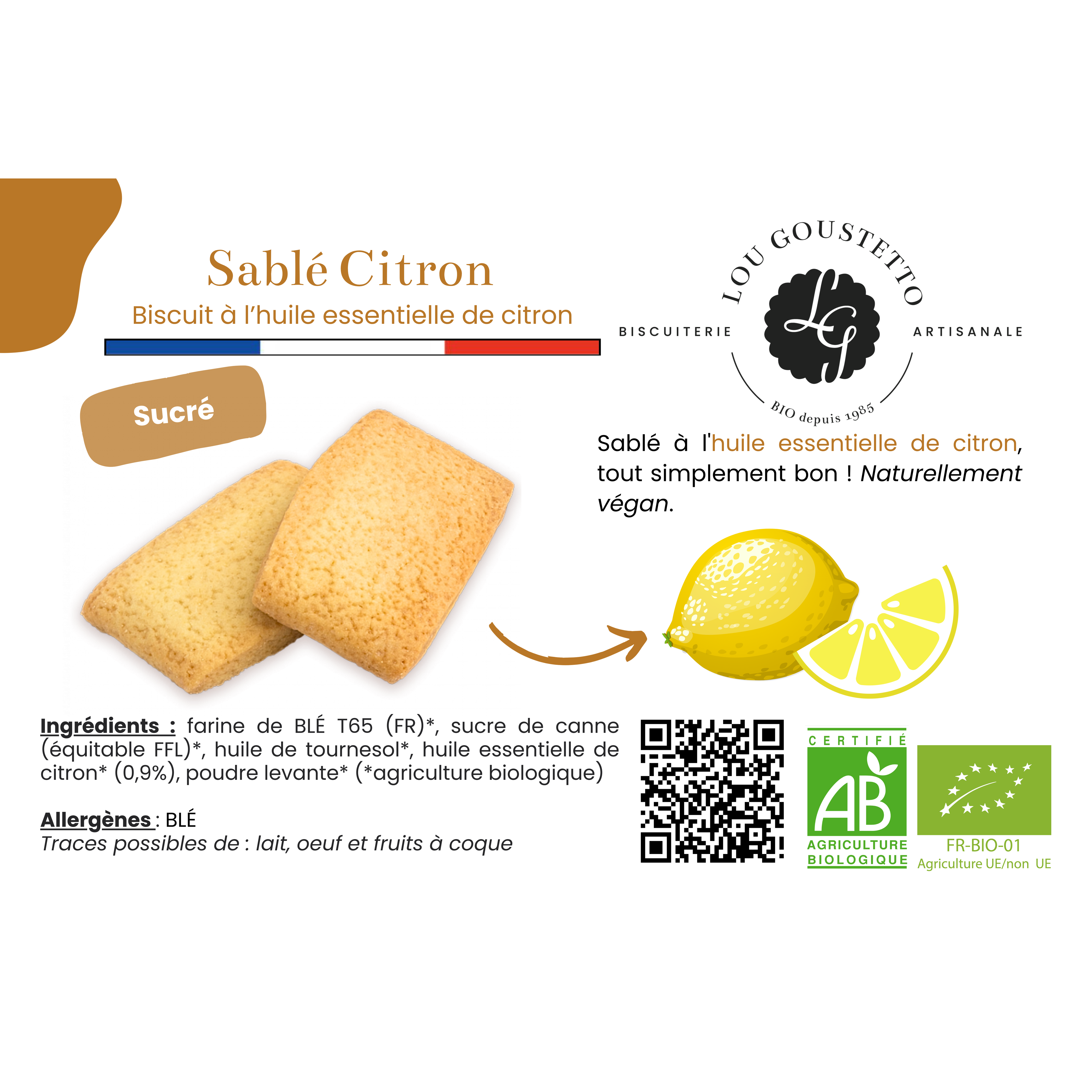 Lou Goustetto est une biscuiterie artisanale située à Signes, au cœur d'un petit village de Provence 🇫🇷. Fondée en 1985, notre entreprise familiale s'est spécialisée dans la fabrication de biscuits sucrés et salés 🍪, tous certifiés 100% biologiques 🌱 et conditionnés en vrac de 3 kg. ✍ Nos valeurs et notre démarche éco-responsable : - Entreprise pionnière dans le Bio et le vrac - Emballage ecofriendly : cartons recyclés et sachets 100% recyclables, garanti sans bisphénol et sans phtalates - Mise en avant des circuits courts et préférence pour les produits et fournisseurs français - Proposition de produits origine France et d'une gamme vegan - Vision du "Zéro déchets" - Utilisation de produits d'entretien inoffensifs pour l'environnement et les utilisateurs 📌 L'origine de nos ingrédients principaux : - Farines de blé et de petit épeautre françaises - Oeufs français - Beurre de Normandie - Huiles essentielles et eaux florales fabriquées près de Grasse - Sucre de betterave cultivé et transformé en France - Roquefort Papillon (AOP) - Sel de Guérande. 🍪 Envie d'une pause gourmande ? Laissez-vous tenter par le Coeur chocolaté, les Navettes de Provence, le sablé Citron Pur Beurre, le Croc Amande Coco et bien d'autres douceurs à déguster. 🍺 Vous êtes plutôt salé ? Craquez pour l'Apéro Pissaladière, l'Apéro Olive & Thym ou l'Apéro Roquefort & Romarin. 💬 Nous réalisons également des fiches descriptives de nos produits pour les commerçants.