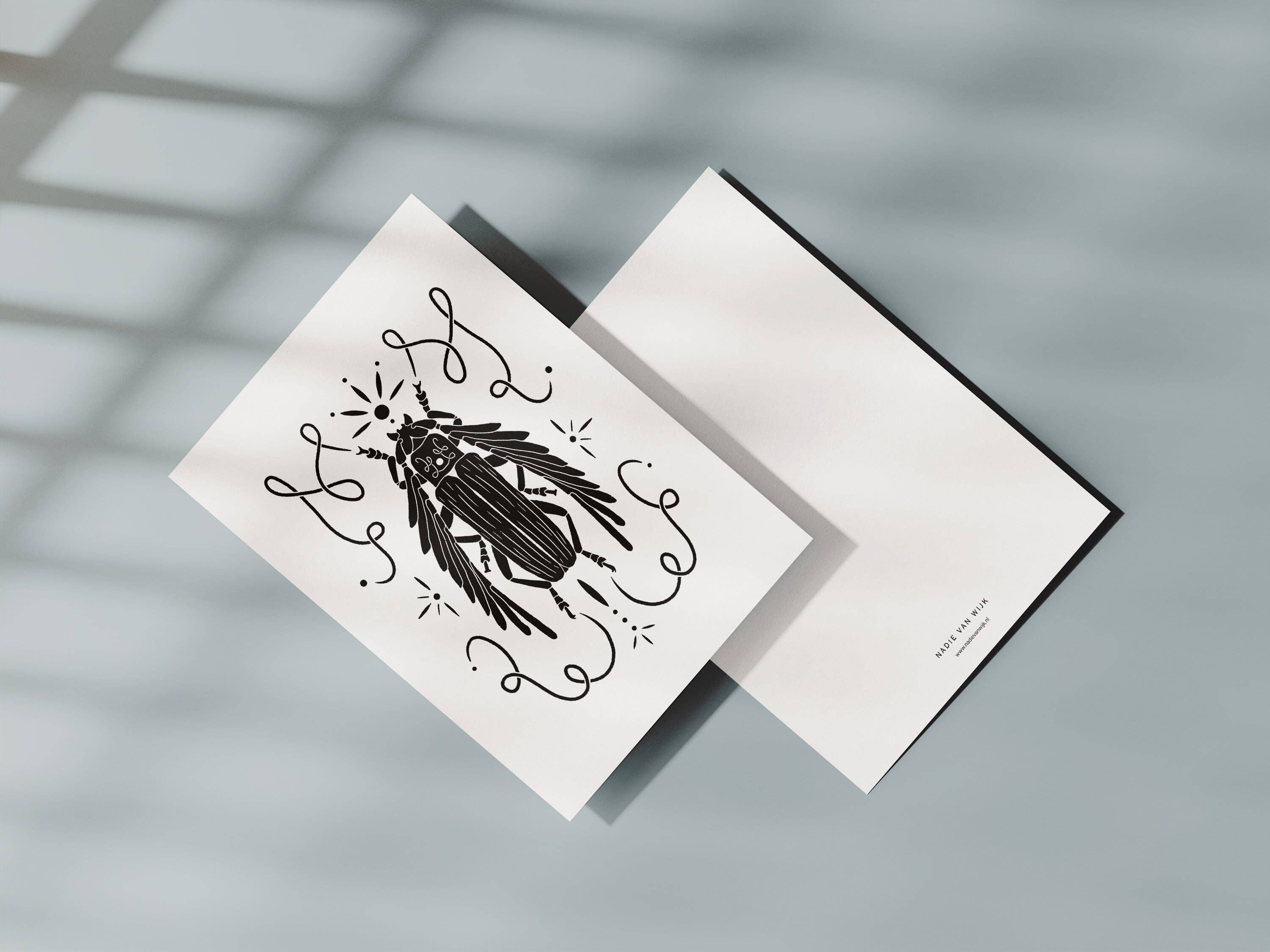 Je suis Nadie van Wijk, illustratrice d'Enschede. Mon travail commence par l'observation et le dessin. Je regarde la nature et ce qui passe souvent inaperçu : crânes, insectes, feuilles, oiseaux et autres animaux. Des formes éphémères mais qui ont du sens si l'on regarde de près. Pour moi, dessiner est une manière de collecter et d'enregistrer, une sorte de petite étude de la nature sur papier. Les illustrations qui en résultent, je les traduis en articles de papeterie : cartes, affiches, calendriers et marque-pages. Tout est imprimé en éditions pratiques mais qui restent personnelles. Le style est épuré, graphique et détaillé, avec beaucoup de contraste, parfois inspiré numériquement par la linogravure. La collection est destinée à apporter des moments d'attention dans la vie quotidienne. Une carte à envoyer, une impression à accrocher, un calendrier que l'on rencontre quotidiennement, des produits simples qui transmettent quelque chose de cette observation. Mes produits conviennent aux magasins qui ont un œil pour le détail et les illustrations originales. Ce sont de petits supports accessibles de mon travail, qui durent longtemps et montrent clairement la main reconnaissable du créateur.