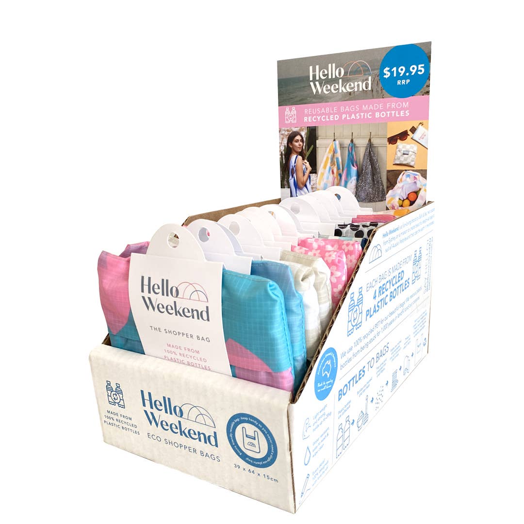 Les aventures du week-end n'ont jamais été aussi belles avec notre gamme de sacs fabriqués à partir de bouteilles en plastique recyclées. Fondée par les cousines Sally et Bec, Hello Weekend est une marque née à Sydney qui crée des sacs et pochettes réutilisables polyvalents, de haute qualité et tendance, fabriqués à partir de bouteilles en plastique recyclées. Les designs exclusifs sont audacieux, uniques et intemporels pour encourager la mode lente et sont conçus pour être solides, résistants à l'eau et légers afin que vous puissiez les charger et ne plus jamais avoir besoin d'un sac en plastique à usage unique. LE VOYAGE MAINTENANT : Les sacs que vous voyez sont une collection de nos designs les plus appréciés avec beaucoup d'autres en préparation. Les produits Hello Weekend sont toujours lumineux, audacieux, tendance, amusants et associés à un impact positif. La passion centrale de l'entreprise est de ne pas créer de nouveaux déchets mais d'utiliser ce que nous avons déjà pour réduire l'impact environnemental de l'entreprise et ne pas coûter la terre dans ce que nous faisons. Le matériau rPET est fabriqué à partir de plastique consommateur recyclé, avec moins d'émissions de carbone dans le processus de fabrication, des encres à base d'huile végétale dans notre impression et tout est conçu par nous. Nous espérons que vous aimerez Hello Weekend autant que nous avons aimé le créer pour vous !