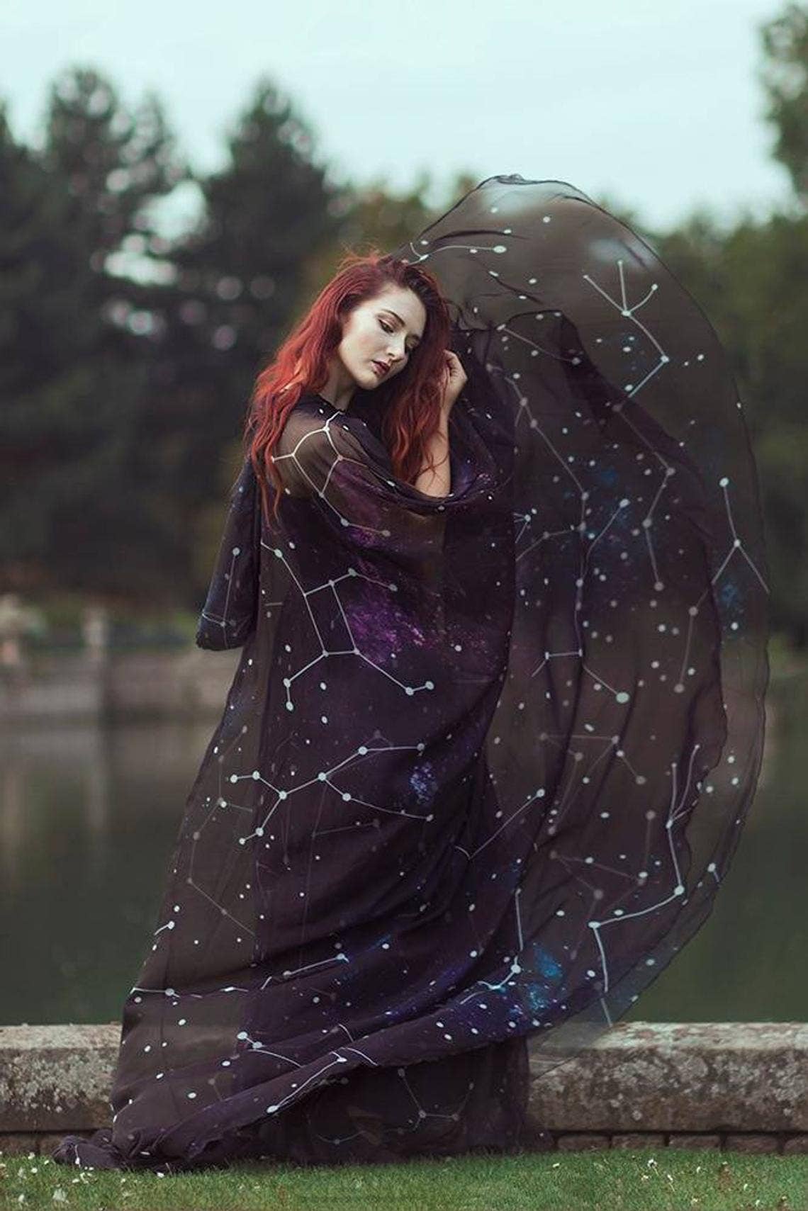 Cette magnifique cape est fabriquée en mousseline imprimée (polyester transparent de haute qualité), avec une belle et grande capuche. Idéal pour un mariage ou un événement médiéval ou fantastique. Longueur : 200 cm Convient à toutes les tailles