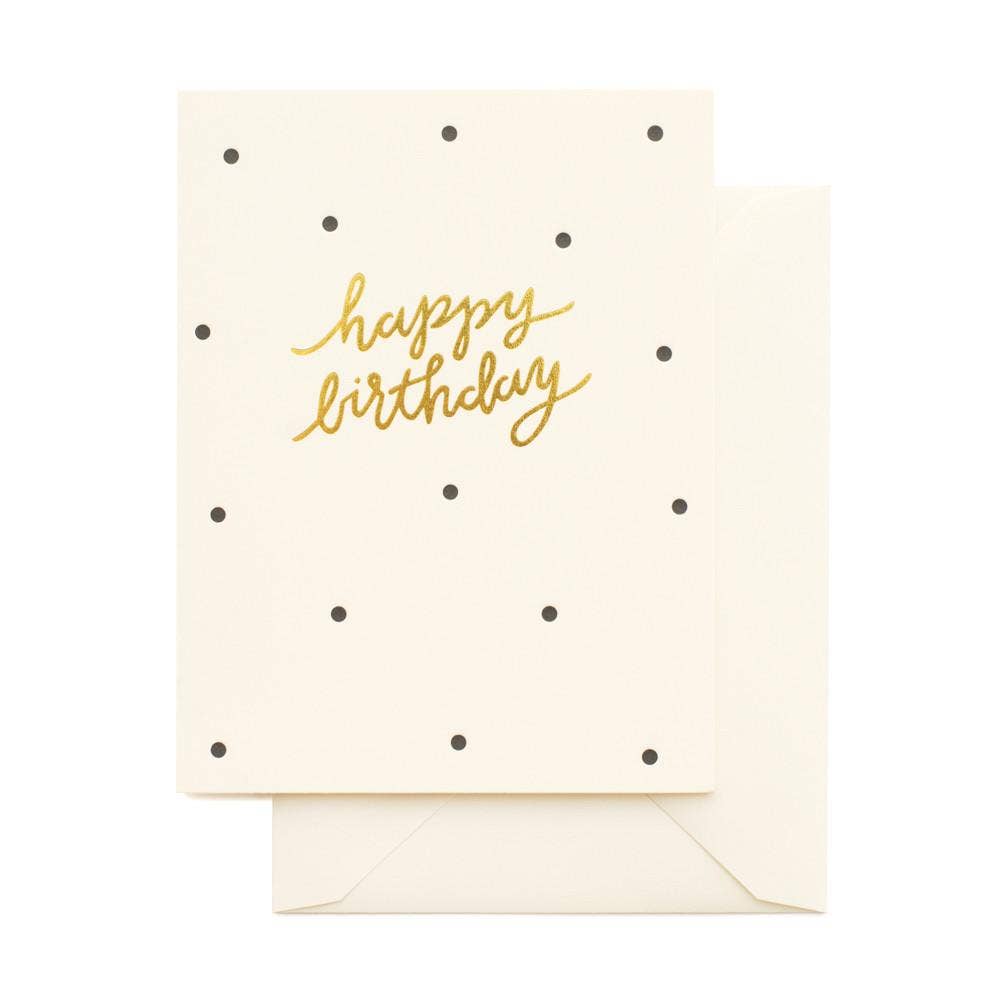* 4,25 x 5,5 pouces * Carte pliée * Imprimée en letterpress avec intérieur vierge * Papier blanc éclatant * Impression en feuille noire et or * Enveloppe rose pâle * BIR106 Envoyez un message attentionné avec l'une de nos cartes d'anniversaire imprimées en letterpress. Un intérieur vierge vous permet d'ajouter votre touche personnelle. Imprimée à la main à Los Angeles.