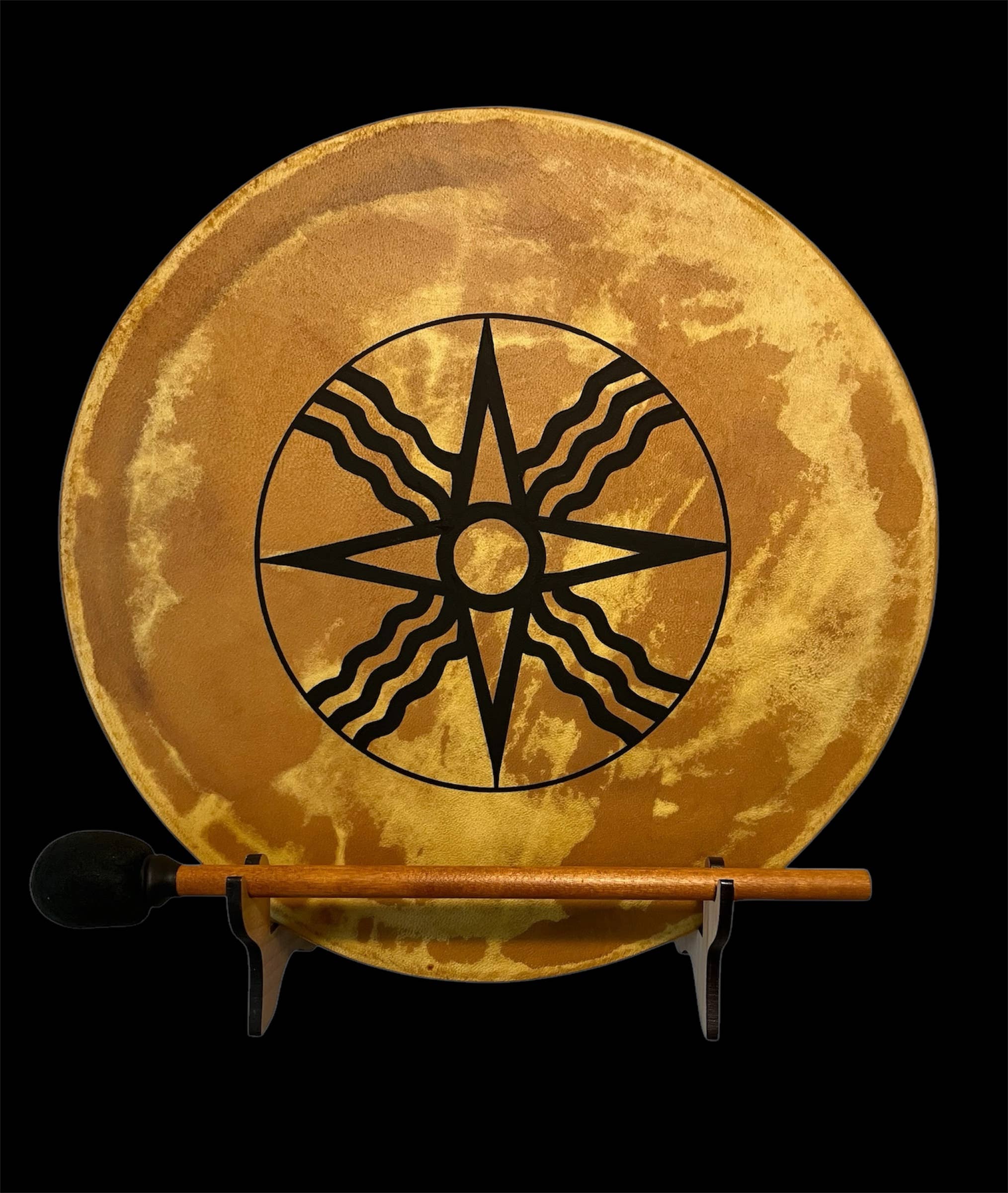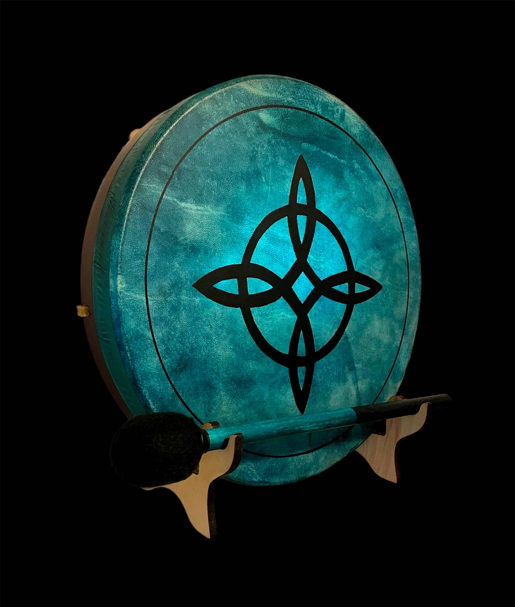 Tambour Chamanique-Tambour Cadre-Amérindien-Tambour Terre Verte-Tambour à Main-Support de Présentation de Tambour LE TAMBOUR TERRE VERTE * Livré avec un maillet sur mesure assorti. * Tambour Cadre de Qualité Artisanale * Cadre en Mûrier ou Bois de Rose * Tailles disponibles : diamètre 12", 14", 16", 18" * Peau de Chèvre teinte à la main en Vert Jade, Or, Marron. * Poignée Confortable Rembourrée * Peau de Chèvre Récoltée Éthiquement * La Peau de Chèvre confère à cette beauté un son naturel et organique. ** Veuillez noter : Chaque tambour est fabriqué individuellement à la main et aucun n'est identique, car les peaux diffèrent en texture et reçoivent les couleurs de teinture et d'encre de manière unique. Par conséquent, les couleurs sont similaires mais pas exactes. Le Support de Tambour Éclairé Drum^Dock® Expose votre tambour et maillet. S'ajuste pour s'adapter aux tambours de 12" à 18" Utilisez-le sur une surface plane comme lampe de table ou fixez-le au mur comme applique. Le Sac de Tambour innerRhythm Deluxe * Parois Intérieures Rembourrées. * Doubles Fermetures Éclair Robustes * Protection Imperméable