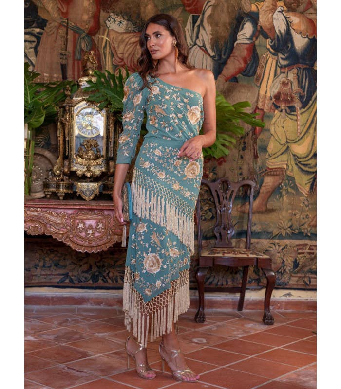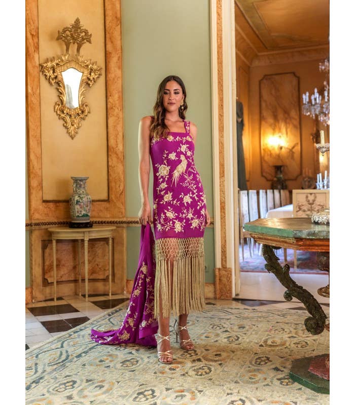 Veste fine beige Káhyra brodée de fleurs flamenco avec châle multicolore en vente B2B