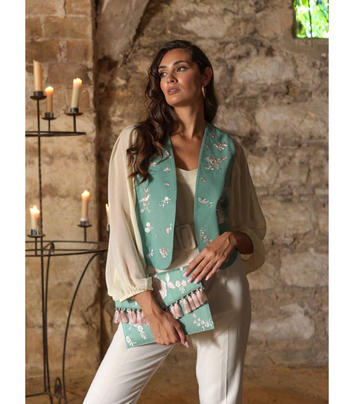 Le produit Veste fine beige Káhyra brodée de fleurs flamenco avec châle multicolore n'a pas encore reçu d'avis.