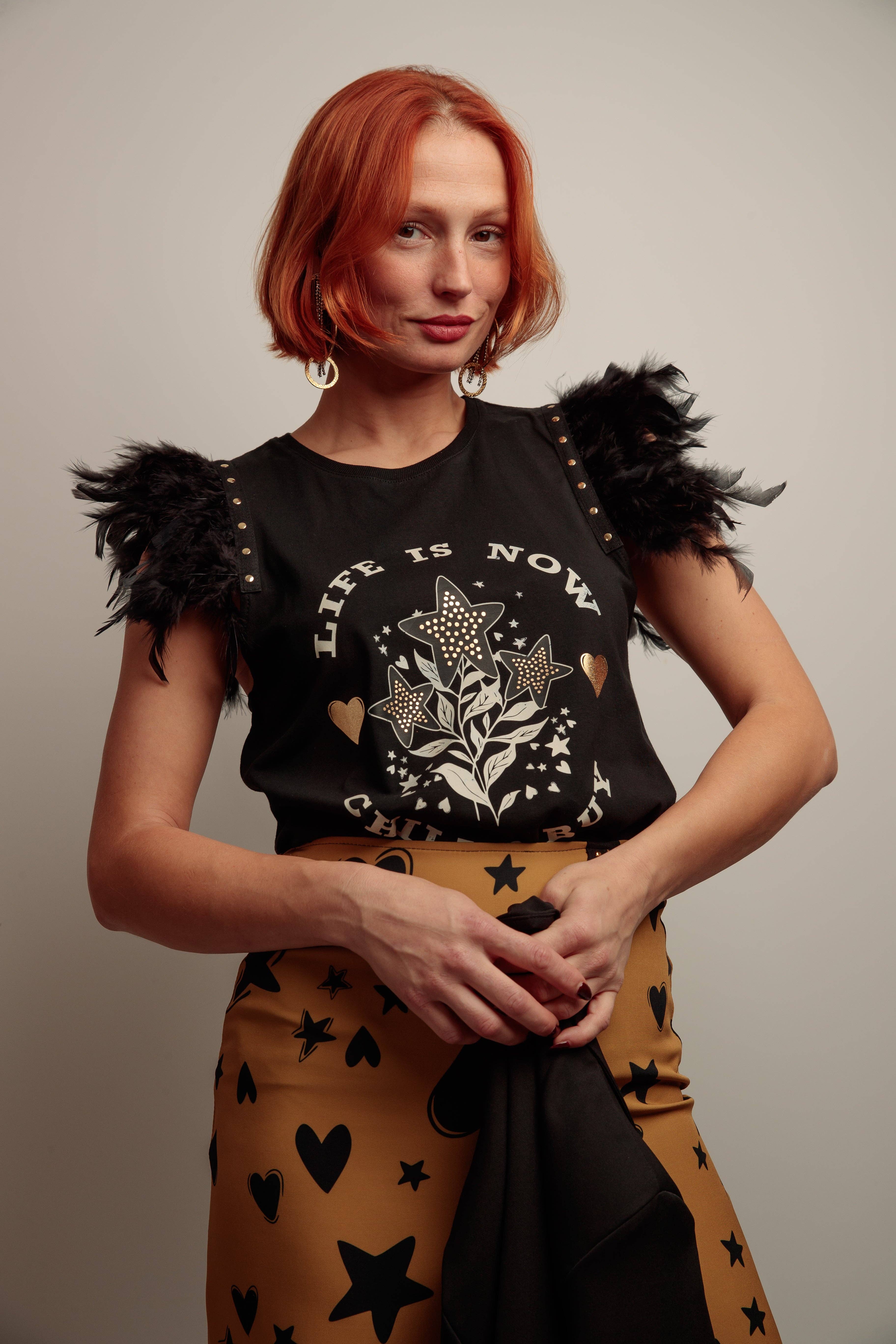 T-shirt en coton 100 % lavé, col rond et manches ornées de volants multiples en tulle. Imprimé sur le devant. Conseils d'entretien : lavage en machine à 30 °C maximum, essorage doux. Ne pas utiliser d'eau de javel. Repasser à l'envers à 110 °C maximum. Ne pas sécher en machine.