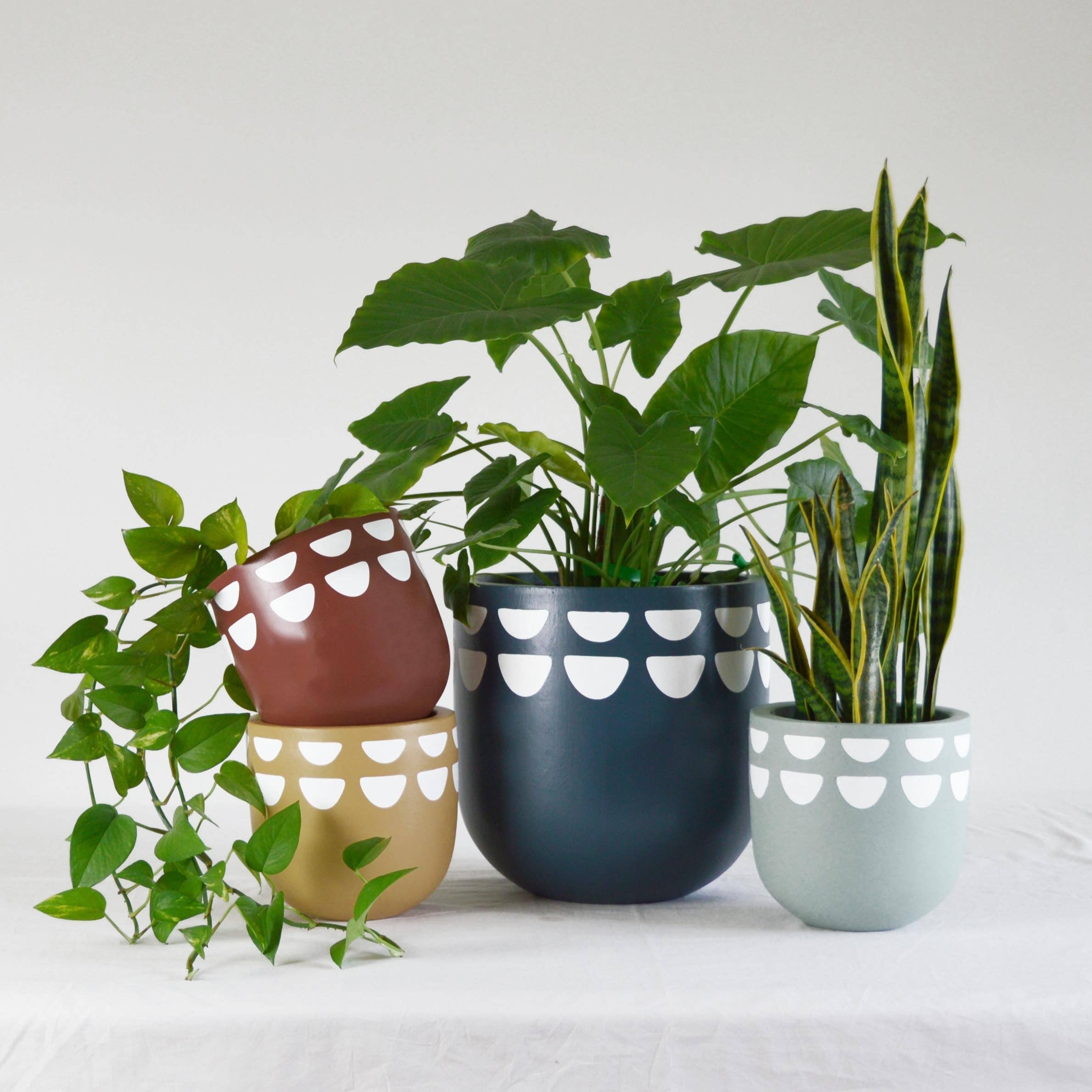 Nous adorons ces magnifiques jardinières. Nous aimons la façon dont elles s'adaptent à nos grandes plantes. Et le fait qu'elles soient toutes peintes à la main. C'est également un plaisir de travailler avec Jennifer !