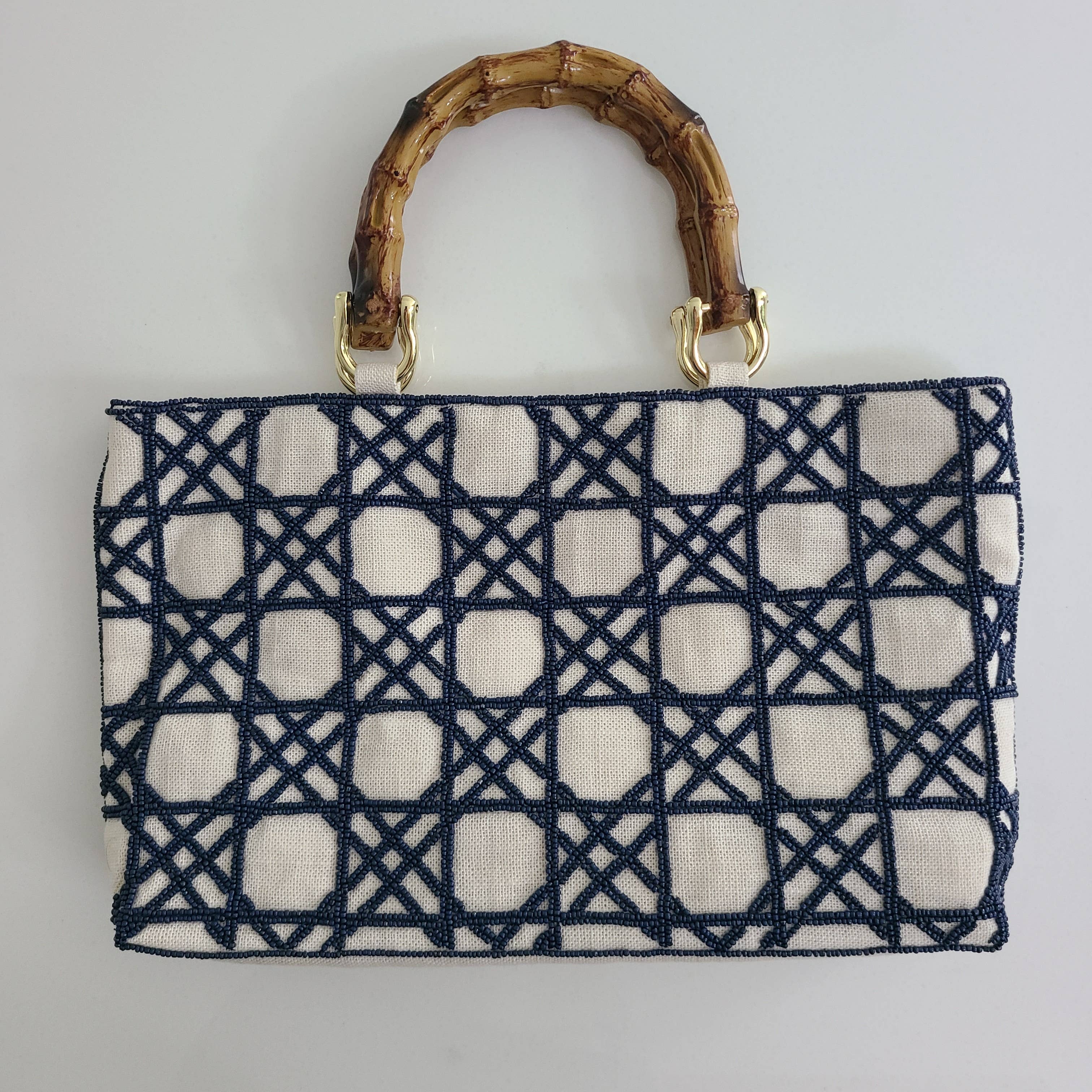 Sac à poignée en bambou découpé entièrement perlé. Ce produit est 100 % fait main et perlé à la main. Doublure en satin luxueuse, avec une petite poche intérieure pour les cartes et autres objets de valeur.