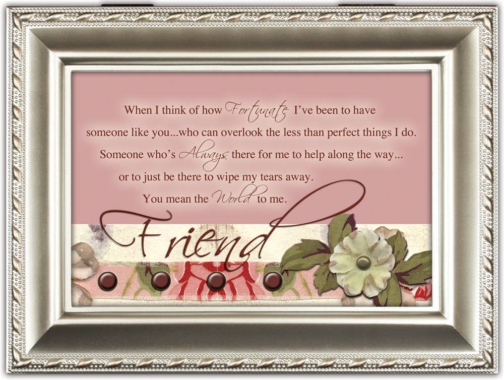 Cette douce boîte à musique présente une finition rose clair avec un bord orné de perles. Le couvercle avec charnière est également un cadre photo double fenêtre ; il est livré avec deux images charmantes : l’une montre d’adorables bébés animaux avec les mots « A Precious Gift », l’autre représente de jolis pieds de bébé. L’une ou les deux photos peuvent être remplacées par la vôtre, découpée en carré d’environ 6,4 cm de côté. À l’intérieur, une petite compartiment avec un dessus en verre transparent révèle le mécanisme musical Sankyo de haute qualité. En tournant la clé sous la boîte, la musique joue lorsque le couvercle est ouvert et s’arrête lorsqu’il est fermé. La chanson jouée est « Jesus Loves Me ». Le compartiment de rangement est doublé d’un luxueux velours noir. Les pieds décoratifs en dessous sont protégés par un rembourrage pour éviter d’abîmer les meubles. La boîte est fabriquée en polymère très résistant qui empêche craquelures et éclats. Dimensions totales : 15 x 10 x 6,4 cm.