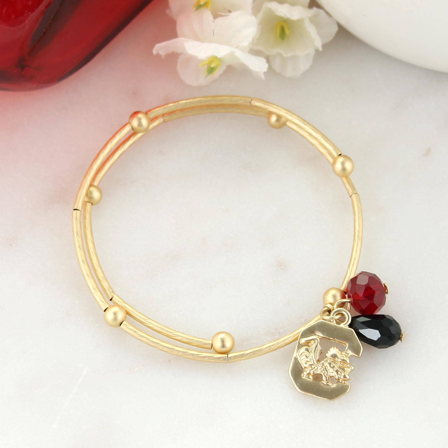 Bracelet portefeuille en métal doré orné d'une breloque en or avec logo Clemson orné de cristaux oranges et incolores et de perles. Il s'agit d'un produit sous licence officielle.