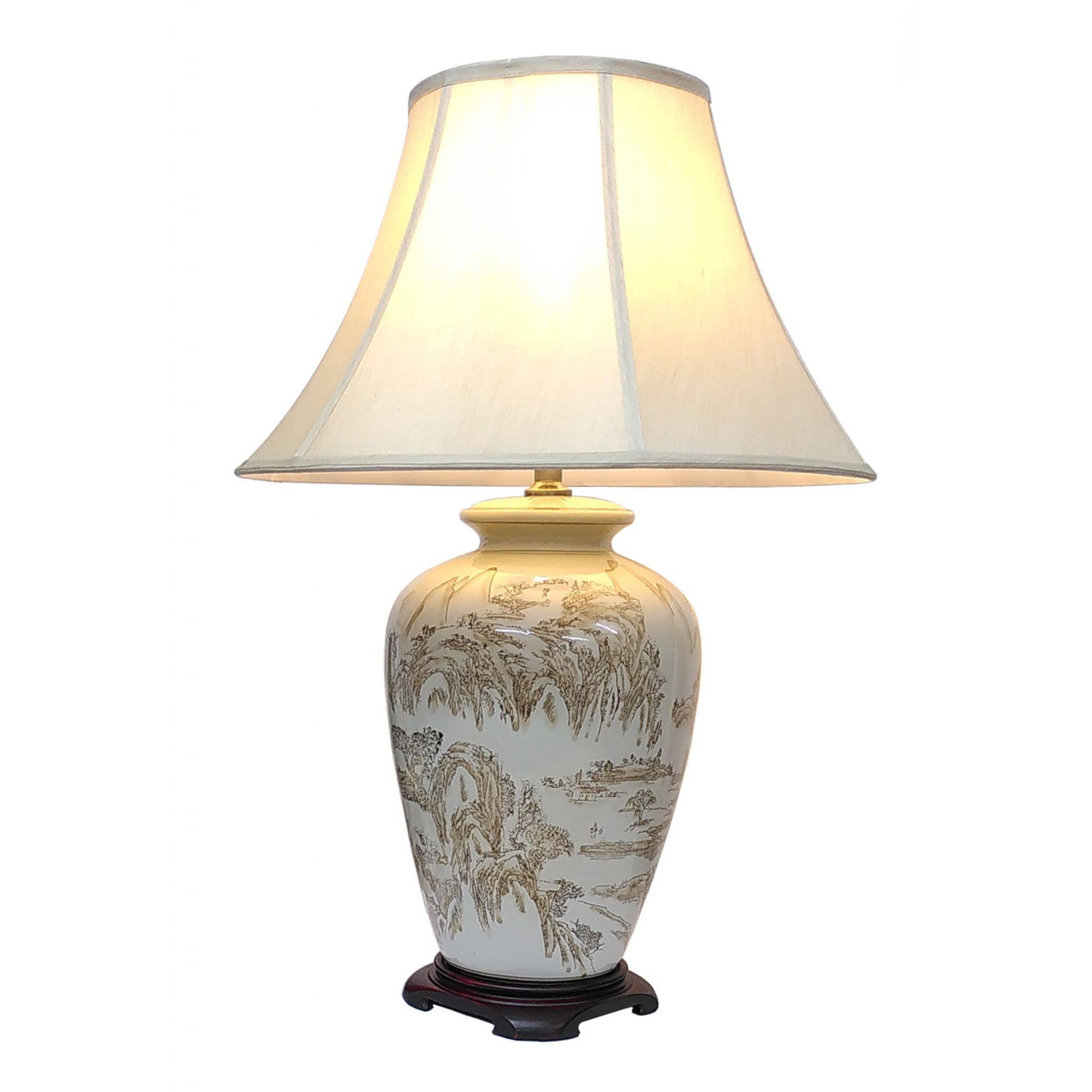Lampe en pot général décorée en bleu et blanc avec des oiseaux tropicaux à longue queue parmi le feuillage, les fleurs et les bourgeons. Construit à partir d'un pot en porcelaine de 26 cm monté sur une base en bois dur et portant un abat-jour en faux soie plissé et doublé d'or. Les lampes sont emballées par paires pour un transport sûr. La commande minimum est d'une paire, c'est-à-dire 2 pièces identiques. Lampe en pot général en porcelaine blanc antique craquelée foncée décorée en bleu avec une scène de paysage classique richement texturée. La scène de la vieille Chine comprend des arbres et des formations rocheuses, une pagode et des bateaux de pêche, des oiseaux et des voiliers, un village et des agriculteurs. Construit à partir d'un pot en porcelaine de 40 cm monté sur un support en bois dur et portant un abat-jour en faux soie doublé de couleur crème. Les lampes sont emballées par paires pour un transport sûr. La commande minimum est d'une paire, c'est-à-dire 2 pièces identiques. Équipé d'une prise à 3 broches UK et d'un interrupteur en ligne. Nécessite une ampoule à baïonnette B22.