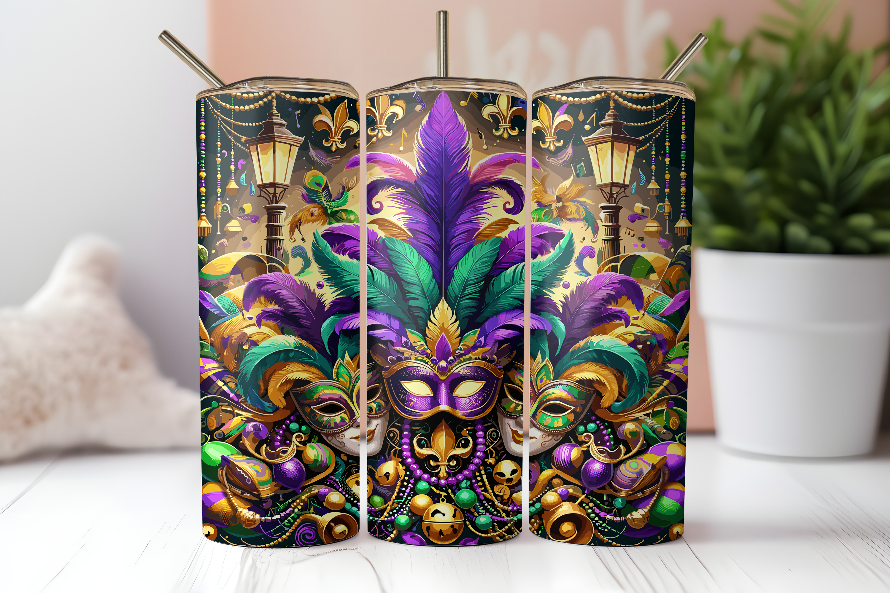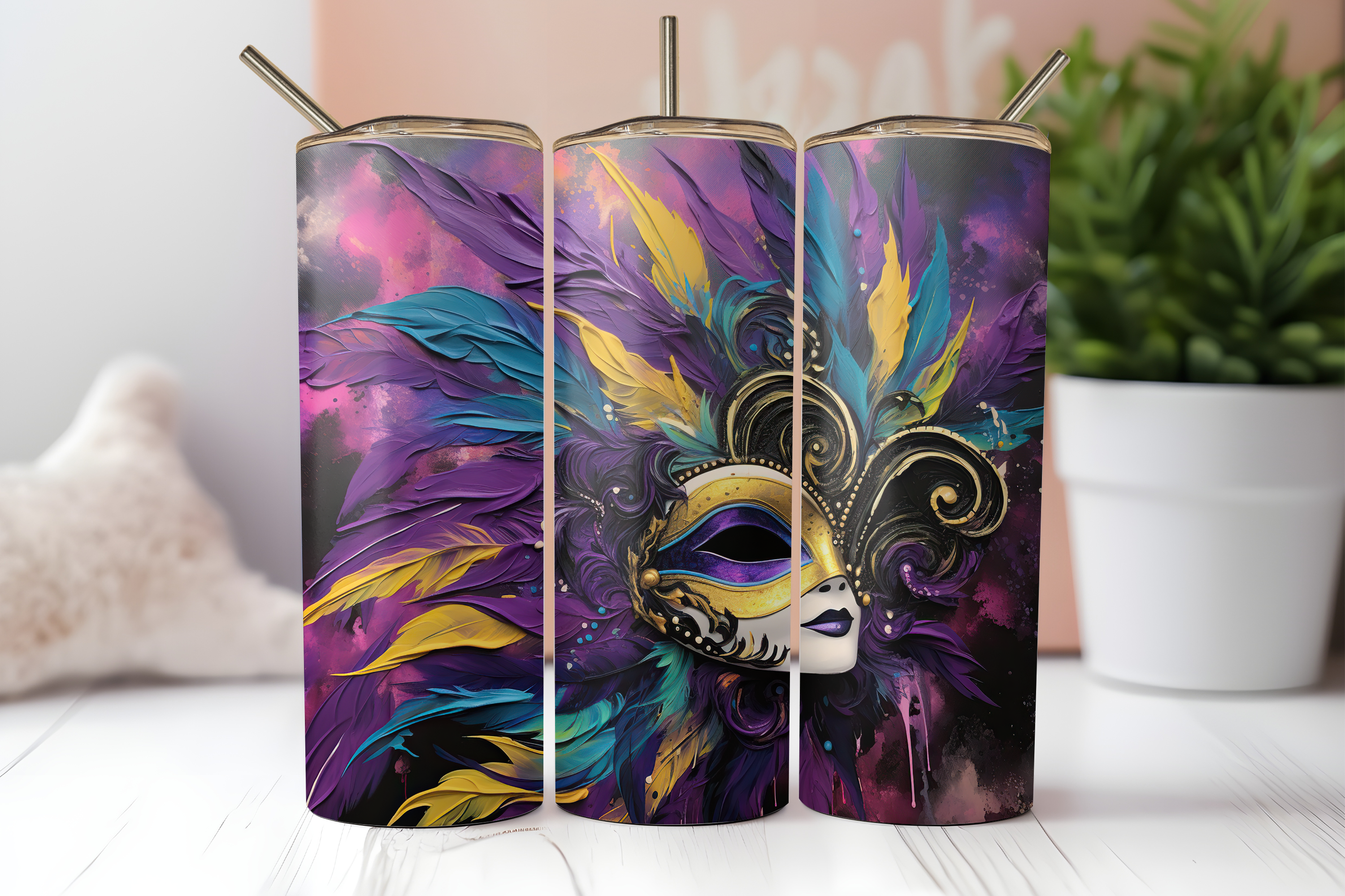 Gobelet Skinny Mask Mardi Gras Feathers Mask 20 oz en vente B2B