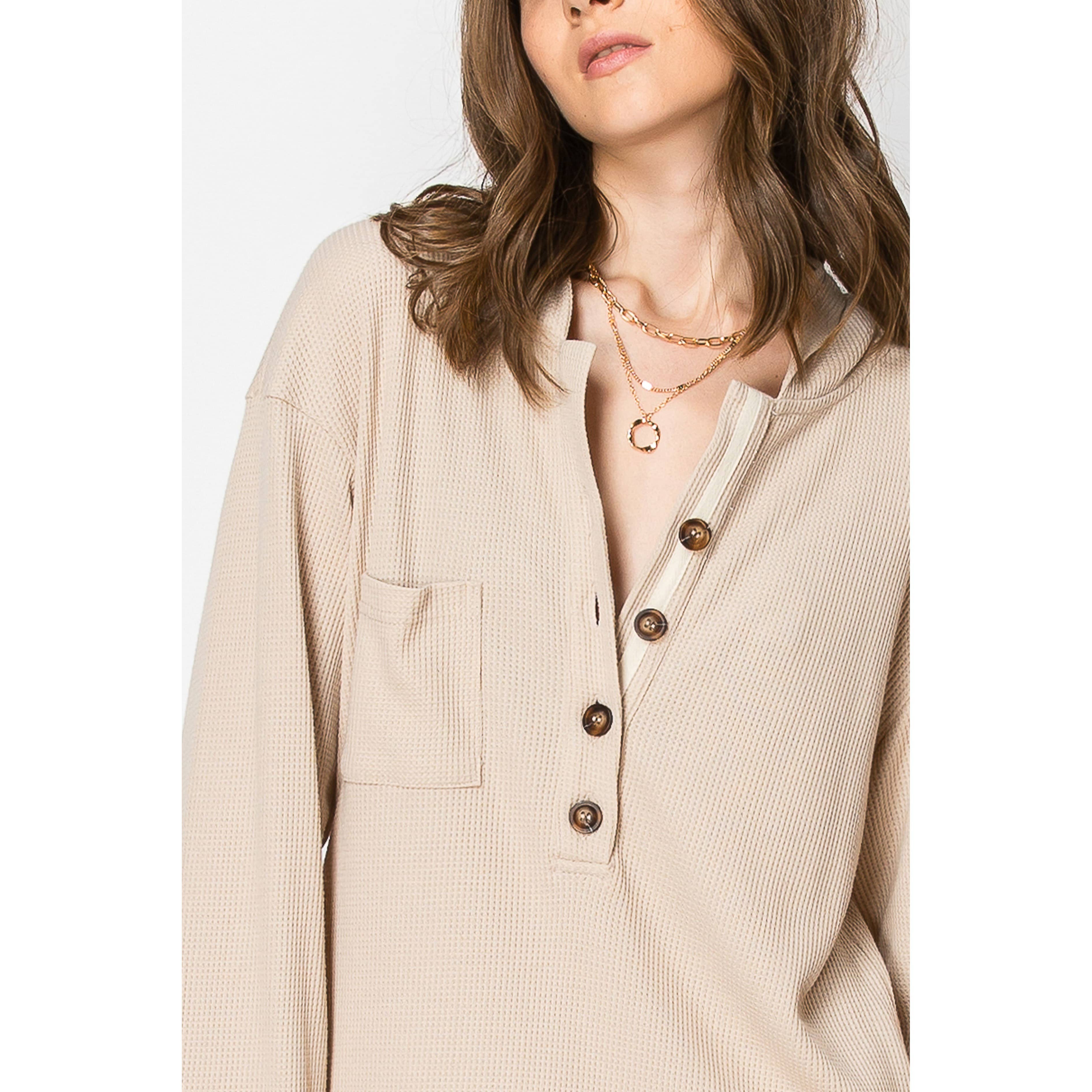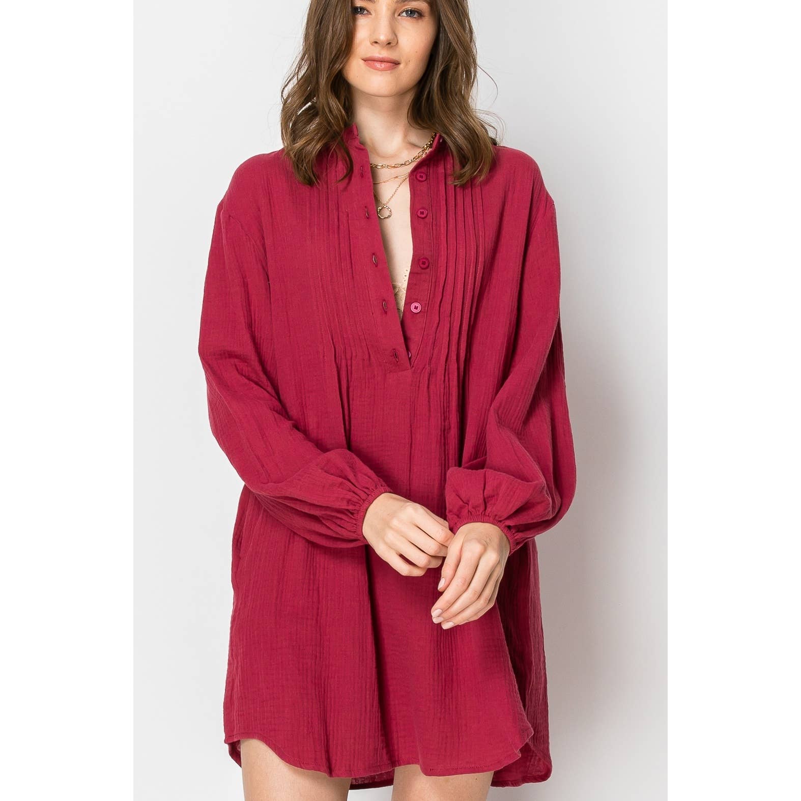 Robe tunique boutonnée à manches longues avec poches, encolure retroussée, manches à bulles, coupe ample, robe-chemise douillette automnale, idéale pour les beaux jours et les superpositions.