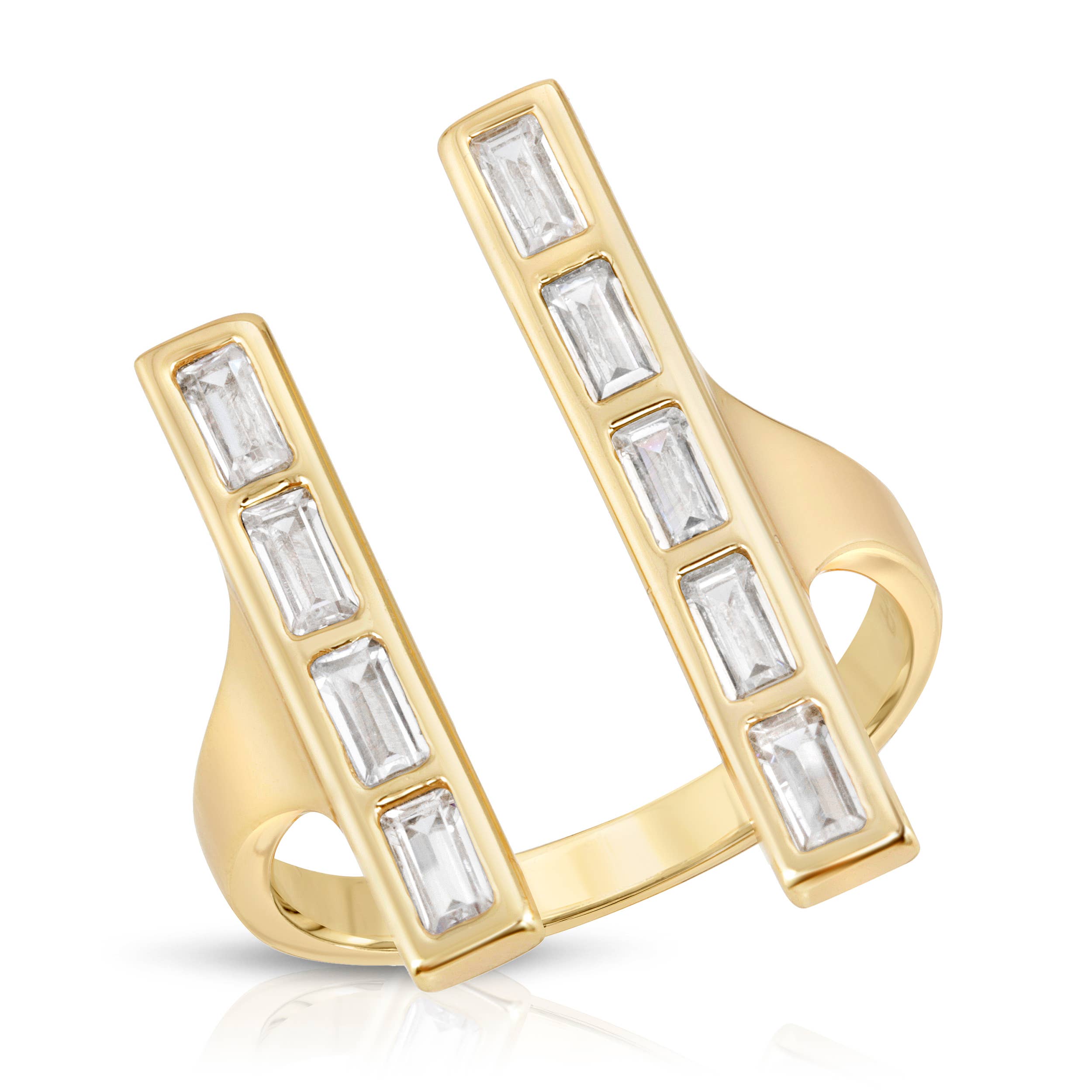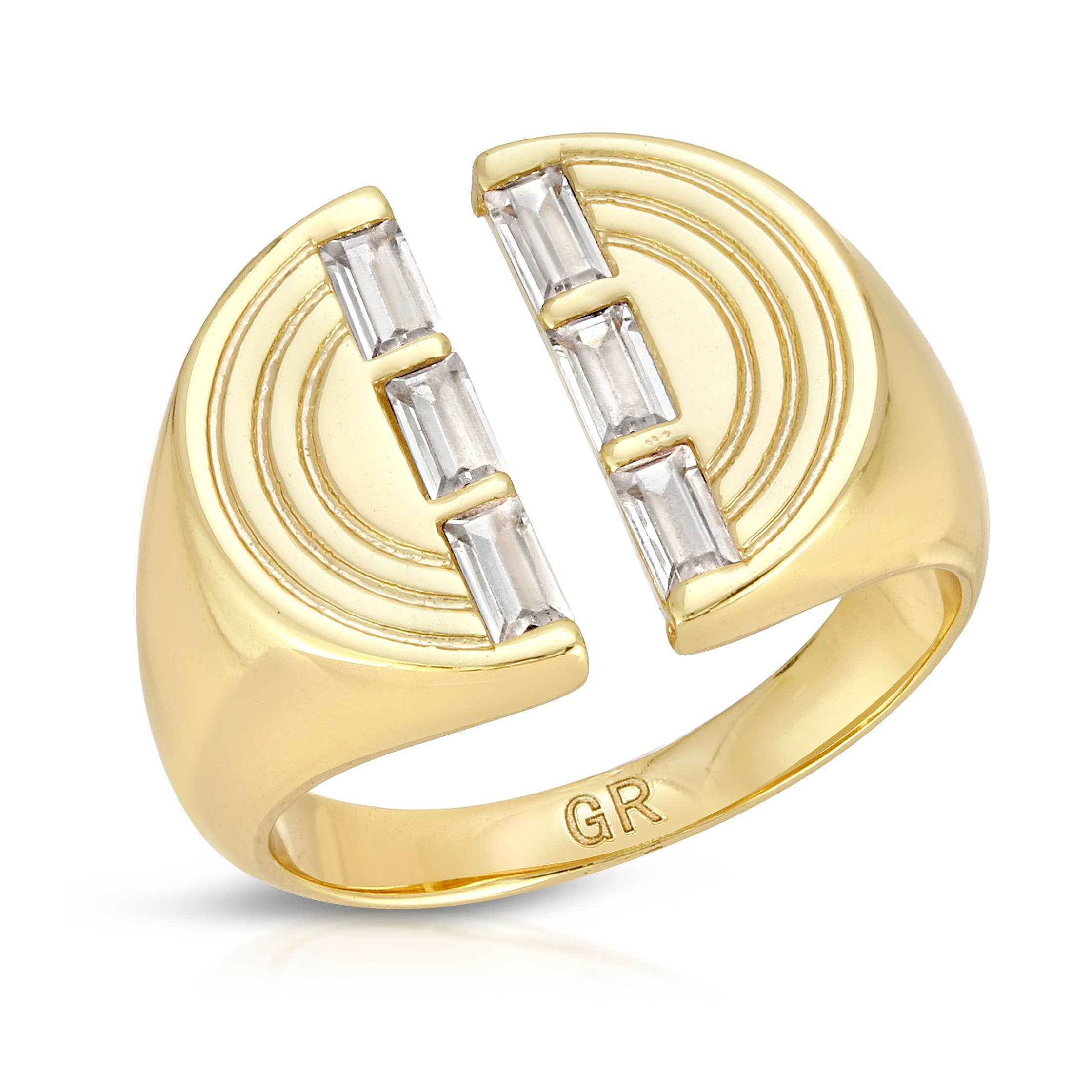 Une chevalière fendue d'inspiration vintage des années 70 mais moderne, ornée de 2 rangées de baguettes. CZ de couleur rubis Tailles 7,8 Légèrement ajustable Or 14 carats sur laiton