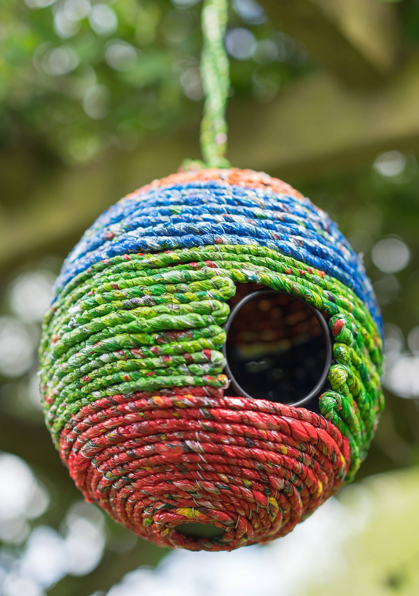 Nichoir écologique tissé à la main à partir de matériaux de sari recyclés. Sa forme en goutte possède une ouverture circulaire de 6 cm et est prêt à être suspendu grâce à un cordon en jute. La longueur totale de suspension atteint 59 cm, ce qui permet de décorer un espace extérieur avec une touche attrayante. Les couleurs peuvent varier. Dimensions : 17 x 17 x 32 cm (ouverture de 6 cm). Matériaux : sari recyclé et métal. En tant que membres de The WFTO, notre fournisseur assure un revenu durable aux artisans via l'exportation d'artisanat fait main vers un marché mondial. Leur entreprise sociale offre également aux artisans, leurs familles et la main-d'oeuvre élargie un accès aux soins de santé, à l'éducation, à l'eau potable, au partage des bénéfices ainsi qu'à des initiatives de renforcement des capacités.