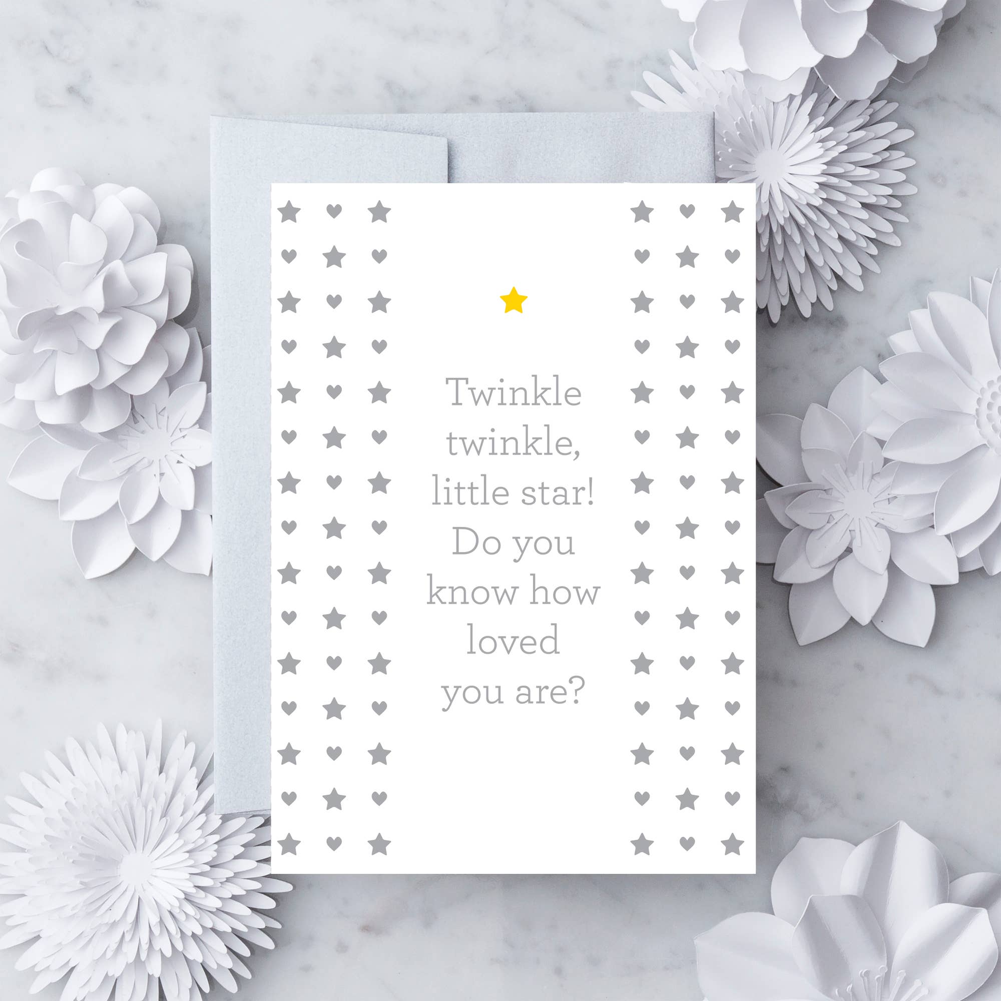 Carte de vœux « Je t'aime d'ici à la lune et au dos ». Intérieur blanc vierge. Prêt pour votre message unique. Imprimé à l'encre argentée. Imprimé sur papier durable de qualité supérieure certifié FSC Enveloppe brillante de qualité supérieure coordonnée incluse Emballé dans un étui en acétate transparent.