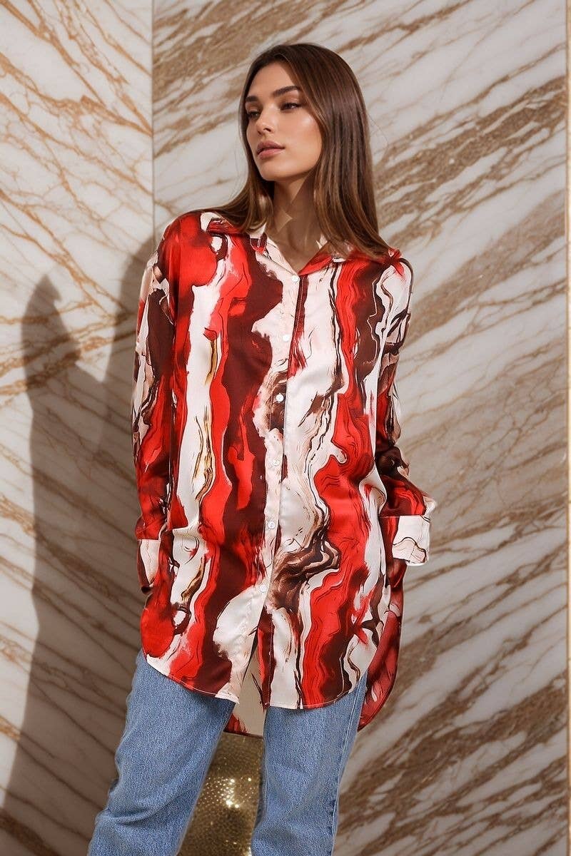 Robe longue imprimée abstraite avec tissu similaire au lin ; Composition : 65% Coton, 35% Polyester ; Taille : M/L,XL/XXL