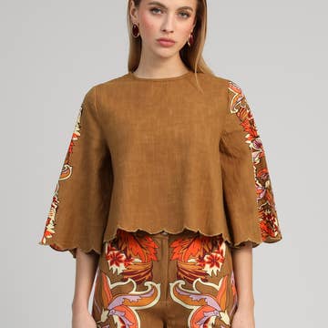 Blouse à manches volantées avec imprimé floral abstrait rouge et bordure en vente B2B