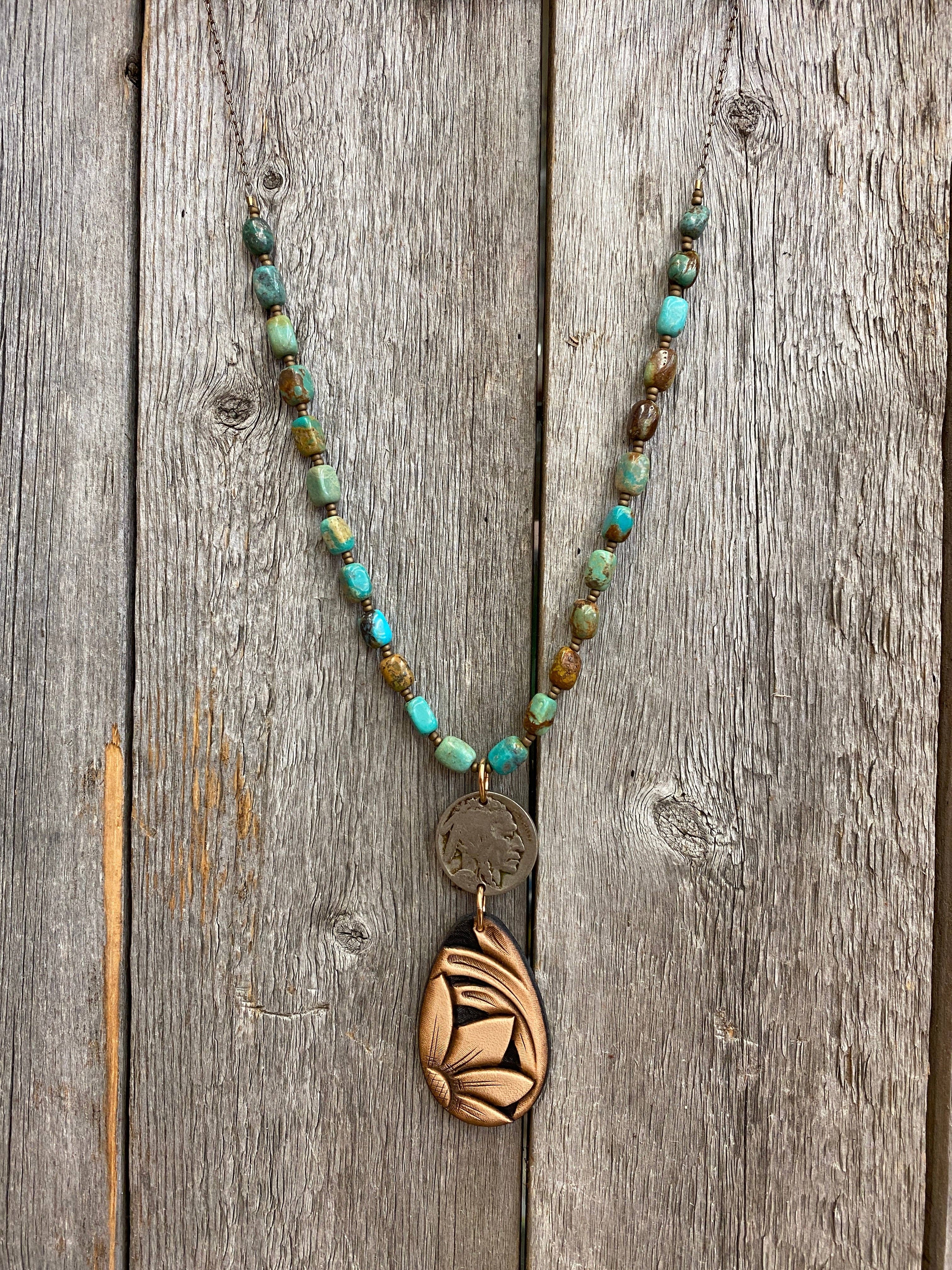 Collier à dos en silice et cuir gemme de 32 pouces avec nickel de buffle et pompon Options de couleur du cuir : brun selle et chocolat
