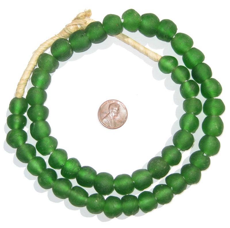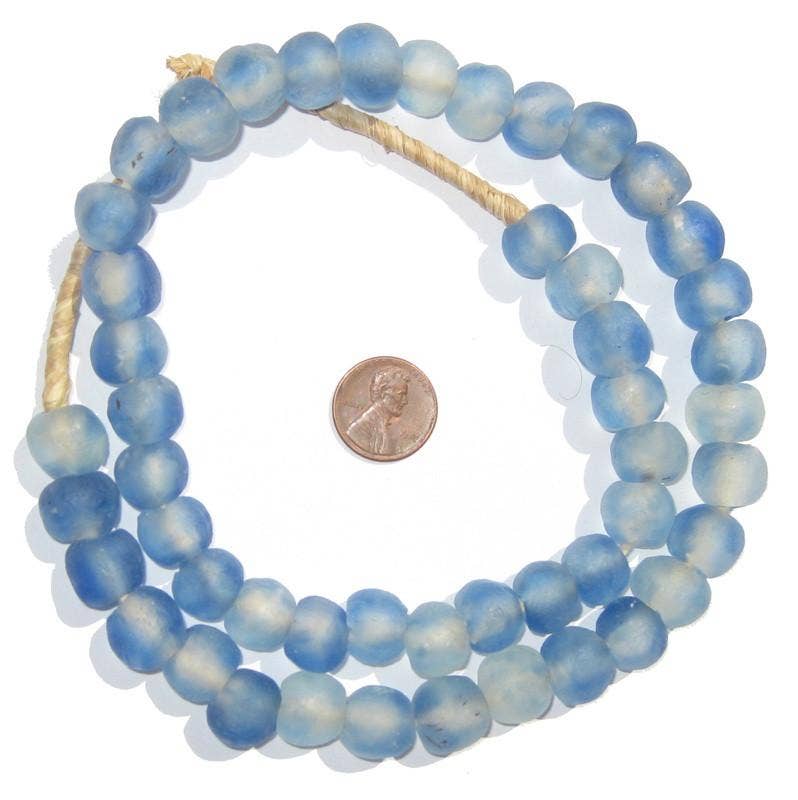 Ces grandes perles sont fabriquées par le peuple Krobo du Ghana, en Afrique. Les perles de verre en poudre sont faites en concassant le verre en poudre fine et en le chauffant de sorte que les particules fusionnent ensemble. Le verre est ensuite versé dans des moules en argile, avec une tige de feuille de manioc utilisée pour faire le trou. Ils sont cuits au four et les fusibles en verre et la tige de manioc brûle. Cette technique est utilisée en Afrique depuis des siècles.