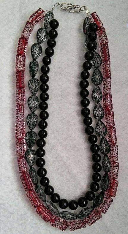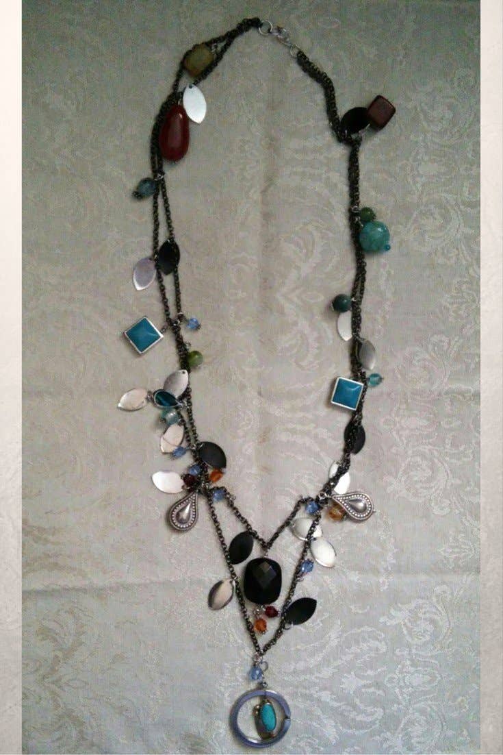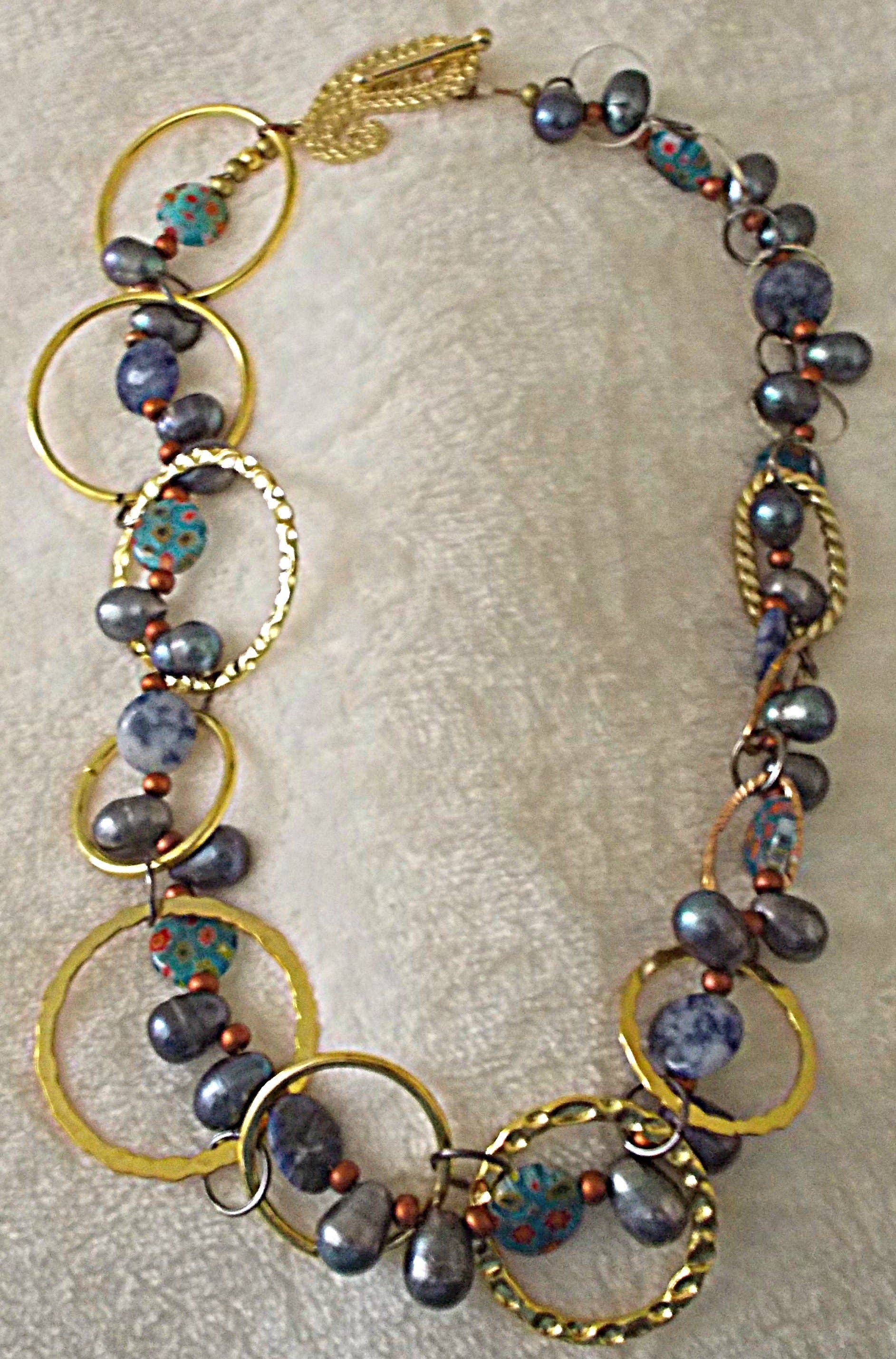 Il s'agit d'un collier de perles de verre avec un fermoir mousqueton. Il est composé de perles de perles, de perles de sodalite et de tubes en laiton à grands trous. Le fermoir est de type homard en laiton antique, et le collier est cousu avec du fil FireLine. 24" y compris fermoir 0.5" largeur Conception/kit par Anna Taylor (boîte à perles Potomac)