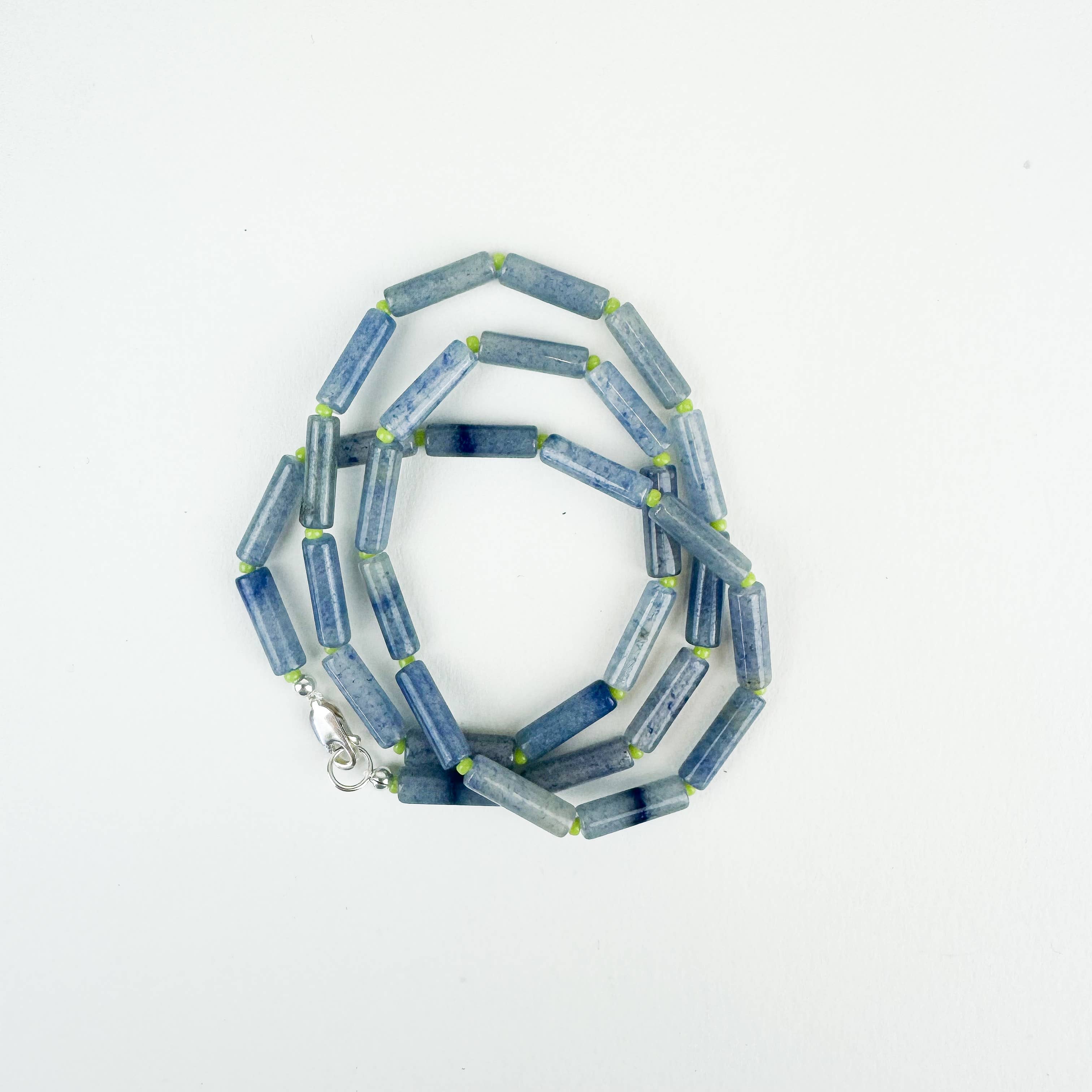 Une excellente pièce de superposition parfaite pour un été à Copenhague. Angelite alternant avec du verre japonais. Un collier ludique et amusant pour la saison. Fabriqué avec un fermoir en argent sterling ou en or rempli 14k. Enfilé sur de la soie. Fabriqué en petites séries. Nous recommandons de retirer avant de prendre une douche en raison de la nature du fil de soie. Si votre collier est mouillé, vous pouvez le poser à plat dans un endroit ensoleillé pour le faire sécher.