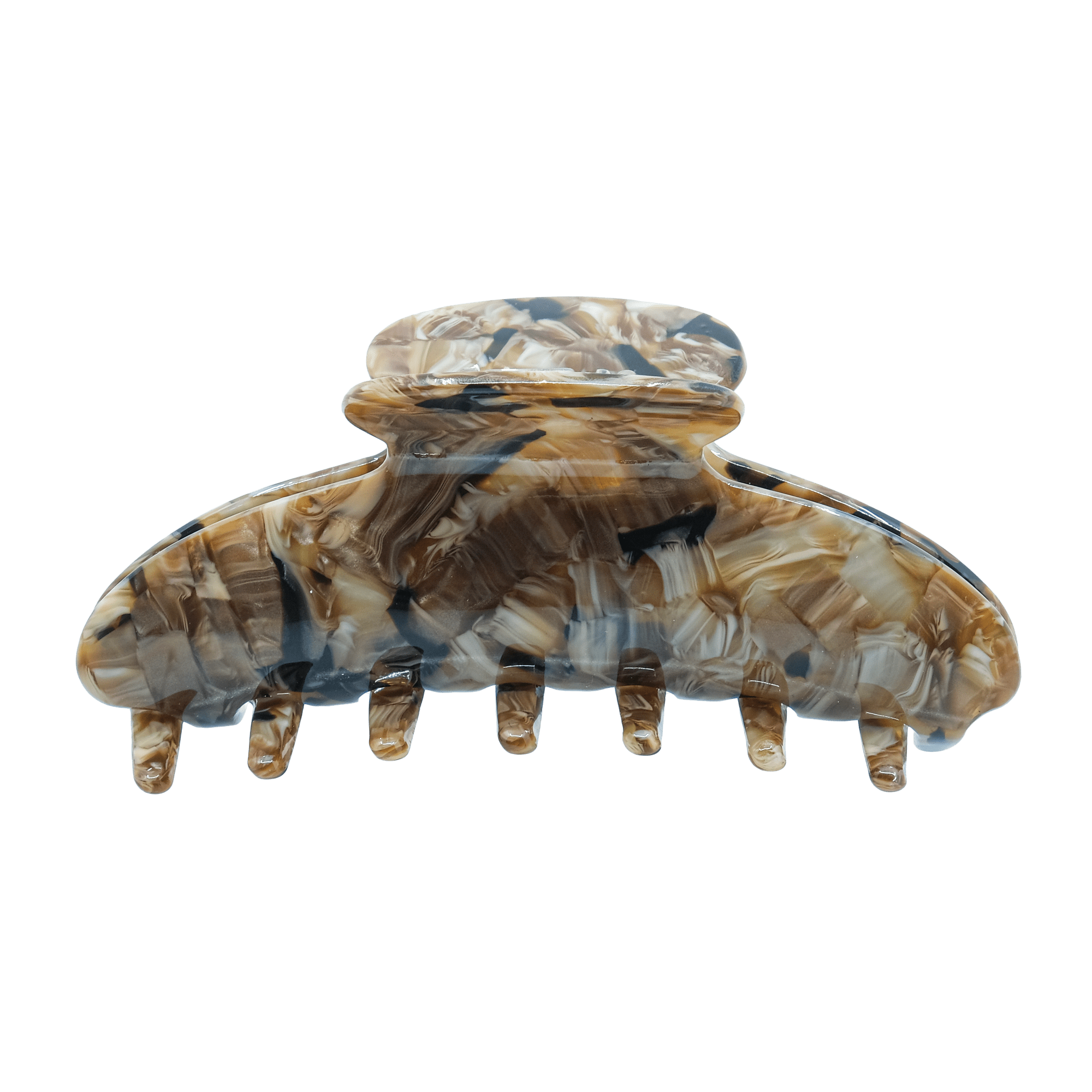 Longueur : 8 cm. Pince à cheveux de qualité, fabriquée en plastique acétate. Ce plastique est d'origine végétale, ce qui en fait un matériau durable. En plus de sa durabilité, l’acétate est l’un des plastiques les plus résistants. Cela rend la pince très solide et réutilisable plusieures fois sans casser les dents. La pince est également très serrée pour bien maintenir les cheveux, même lors d’activités sportives. La couleur est vive, combinant un blanc brut et un motif marbré. Cette teinte marbrée s’accorde parfaitement avec des tenues claires ou blanches.