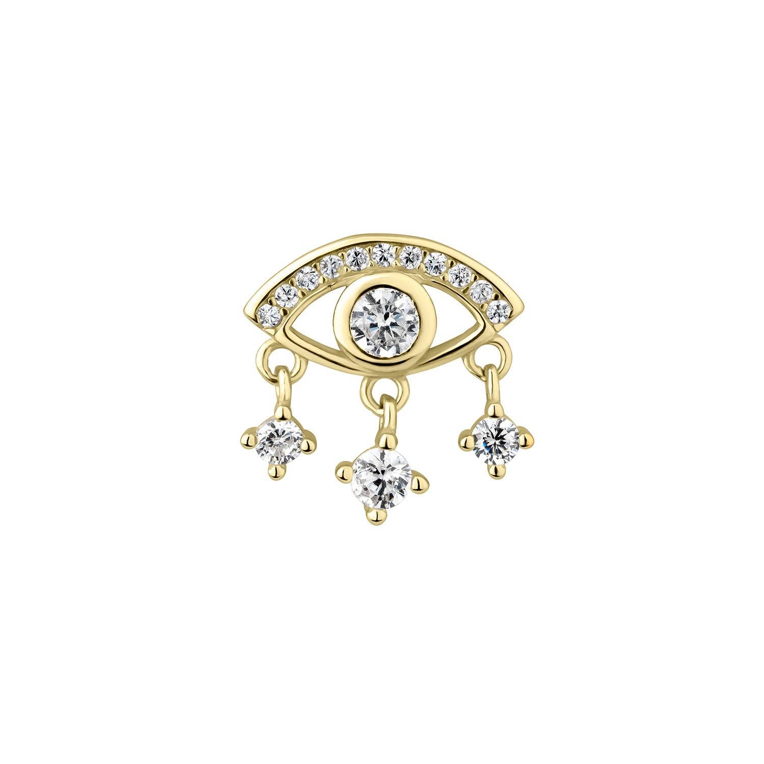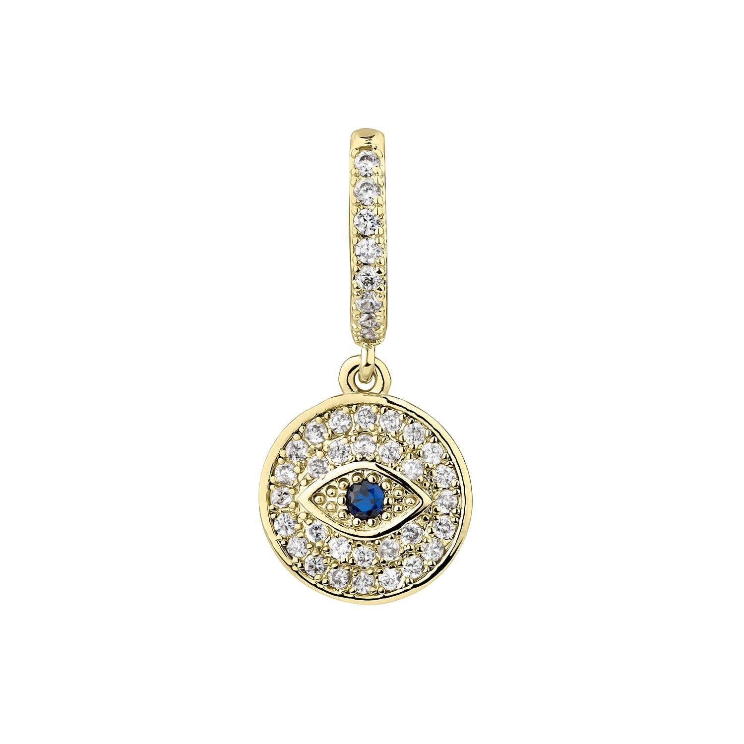DÉTAILS Boucle d'oreille piercing Cosmic Protection en argent sterling 925 avec placage en or jaune 18 carats avec sertissage en zircone aux teintes bleues et turquoises et perles blanches. Il s'agit d'une boucle d'oreille aux motifs de l'œil turc et de l'œil de la Providence qui apportera toute la protection nécessaire. * Matériau : argent sterling 925. * Finition : placage en or jaune 18 carats. * Pierres : zircones bleus, turquoises et perles. * Fermeture : pression. * Dimensions : longueur : 50 mm, largeur : 11 mm. Vendu à l'unité. INSPIRATION Amulette oculaire turque Un œil turc, également connu sous le nom de nazar, est une perle en forme de goutte plate contenant la forme d'un œil auquel des forces protectrices sont attribuées.