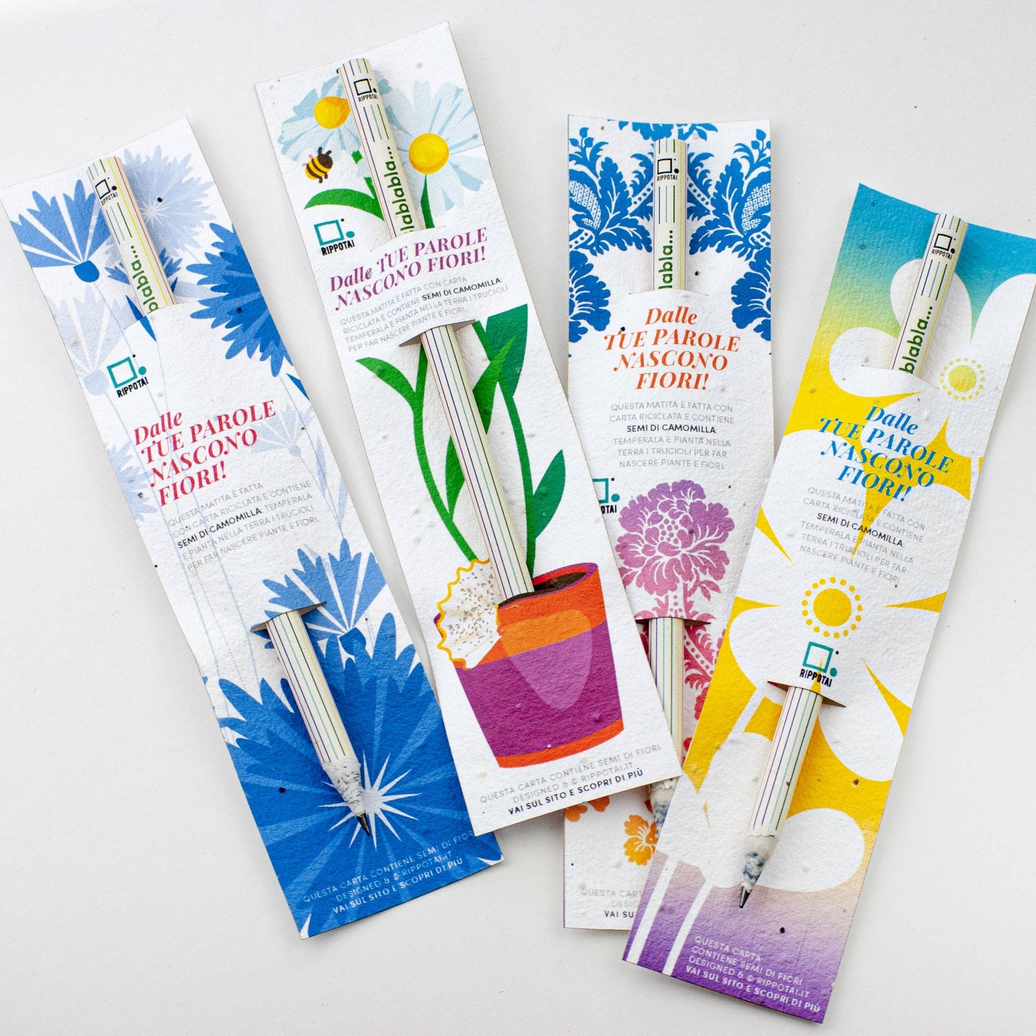 Écrivez, taillez et plantez ! Les crayons plantables font toujours partie de la gamme Teiknote. Ils sont fabriqués à partir de papier journal recyclé mélangé à des graines de camomille. À chaque fois que vous taillez le crayon, les copeaux peuvent être plantés : les mots donnent naissance aux fleurs. Le crayon plantable est inséré dans un blister original également fait de papier plantable contenant des graines de fleurs variées, très appréciées des abeilles et des papillons. Vous pouvez utiliser le blister comme marque-page et, lorsque vous ne souhaitez plus l’utiliser, il suffit de l’humidifier abondamment et de le déposer dans un pot avec un peu de terre. Recouvrez de terre, arrosez et laissez pousser.
