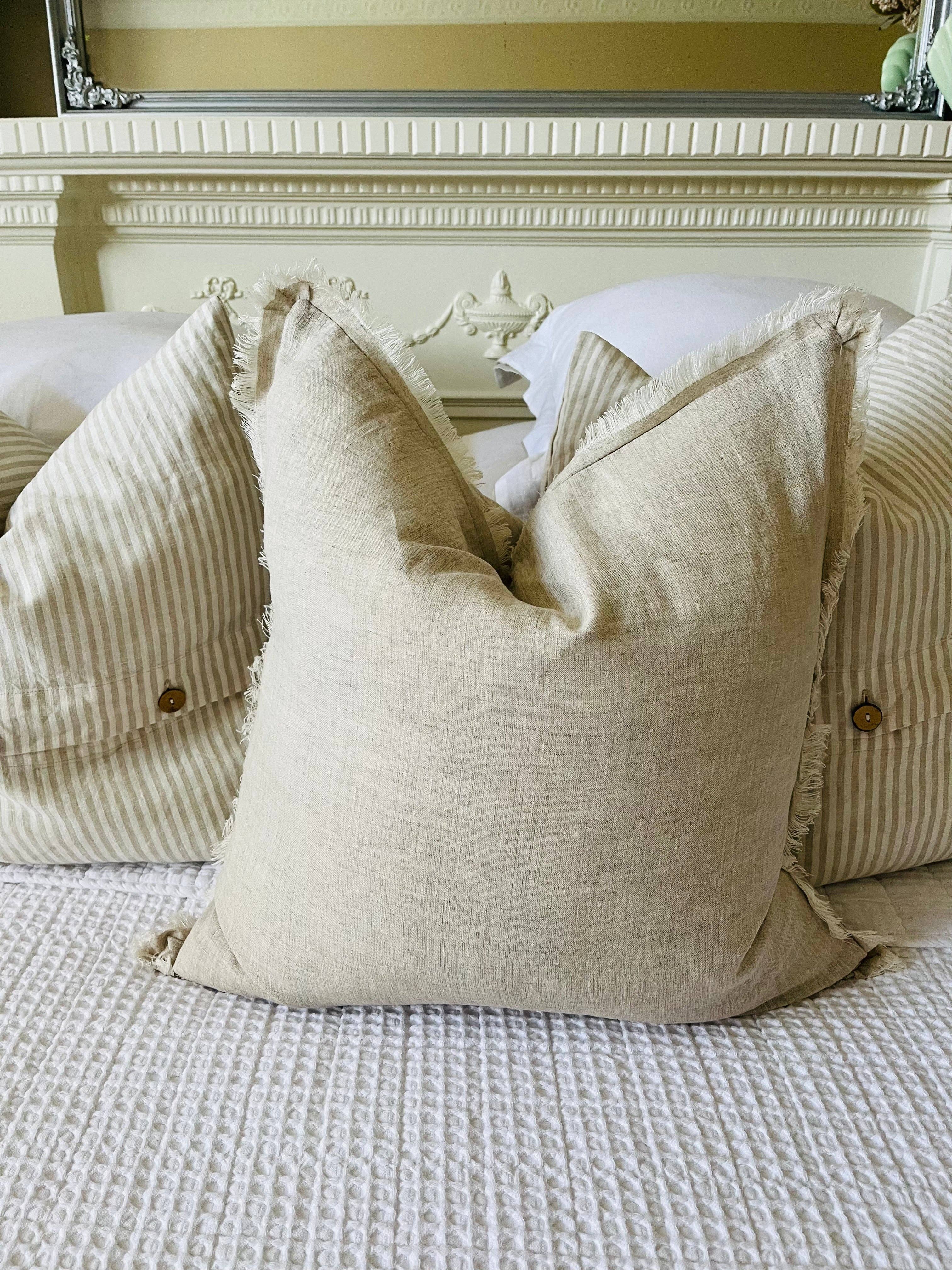 Peut-on jamais avoir trop de coussins… jamais personne ne l’a dit ! Mais quel plaisir ce serait de ne pouvoir acheter que les housses ! Combien d'entre vous ont tellement de coussins qu'ils ont perdu le compte ? Plutôt que d’en ajouter, il suffit d'avoir de belles housses neuves pour changer de style à tout moment. Notre magnifique collection de housses de coussin en 100 % lin français pur est douce, naturelle et diffuse une couleur neutre partout. Le tissu est vraiment superbe... certifié OEKO-TEX (sans produits chimiques nocifs). Dimensions : 45 x 45 cm avec un double volant de 4 cm. Pas d’insert, housse de coussin seule.