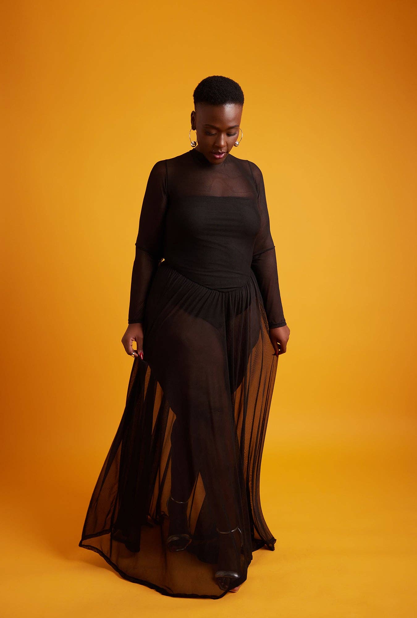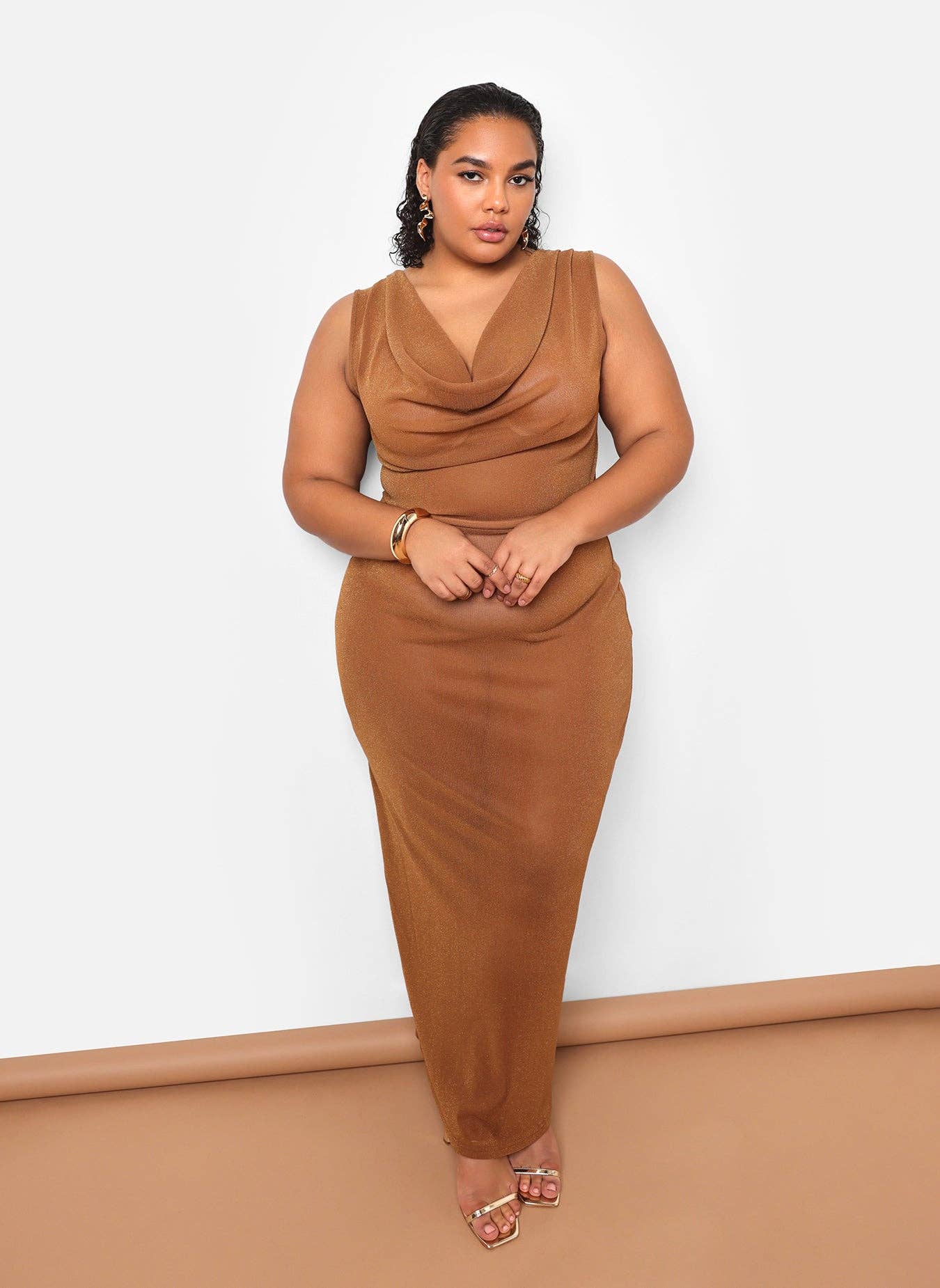 Robe longue moulante à col bénitier en maille transparente à paillettes Samira - Mocha