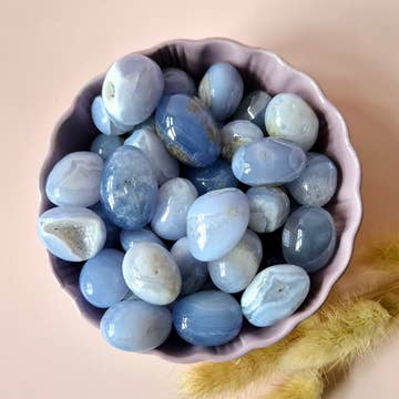 Tour de cristal en agate bleue de haute qualité naturelle / Pointe / Tranche Échelle de dureté minérale de 10 points : 6,5 - 7,0 (10 - Dur, 1 - Mou) Quantité : 1 tour d'agate bleue au total. Vous recevrez la pierre précieuse exacte sur les photos. Taille : Environ 8 cm de hauteur x 4,2 cm de largeur x 1,5 cm de profondeur Poids : Environ 96 grammes L'avant et l'arrière ont été polis et les bords sont encore à l'état brut. Des précautions ont été prises pour garantir que les poids et les mesures sont aussi précis que possible, cependant veuillez noter qu'ils sont seulement approximatifs. Ces pierres sont taillées dans de la pierre naturelle, elles ne sont donc pas parfaites et sans défauts. Les inclusions naturelles, fissures et cavités sont toutes visibles et font partie intégrante de la pierre naturelle. L'agate bleue est l'un des cristaux les plus rares car elle ne peut être trouvée que dans une seule mine en Namibie. Le nom vient des lignes blanches à travers la pierre qui créent un motif semblable à de la dentelle. Les propriétés métaphysiques de l'agate bleue incluent : - Énergie douce et apaisante - Très stabilisante - Apporte confiance et loyauté - Encourage la maturité - Aide à renforcer la confiance, notamment lors de la prise de parole en public