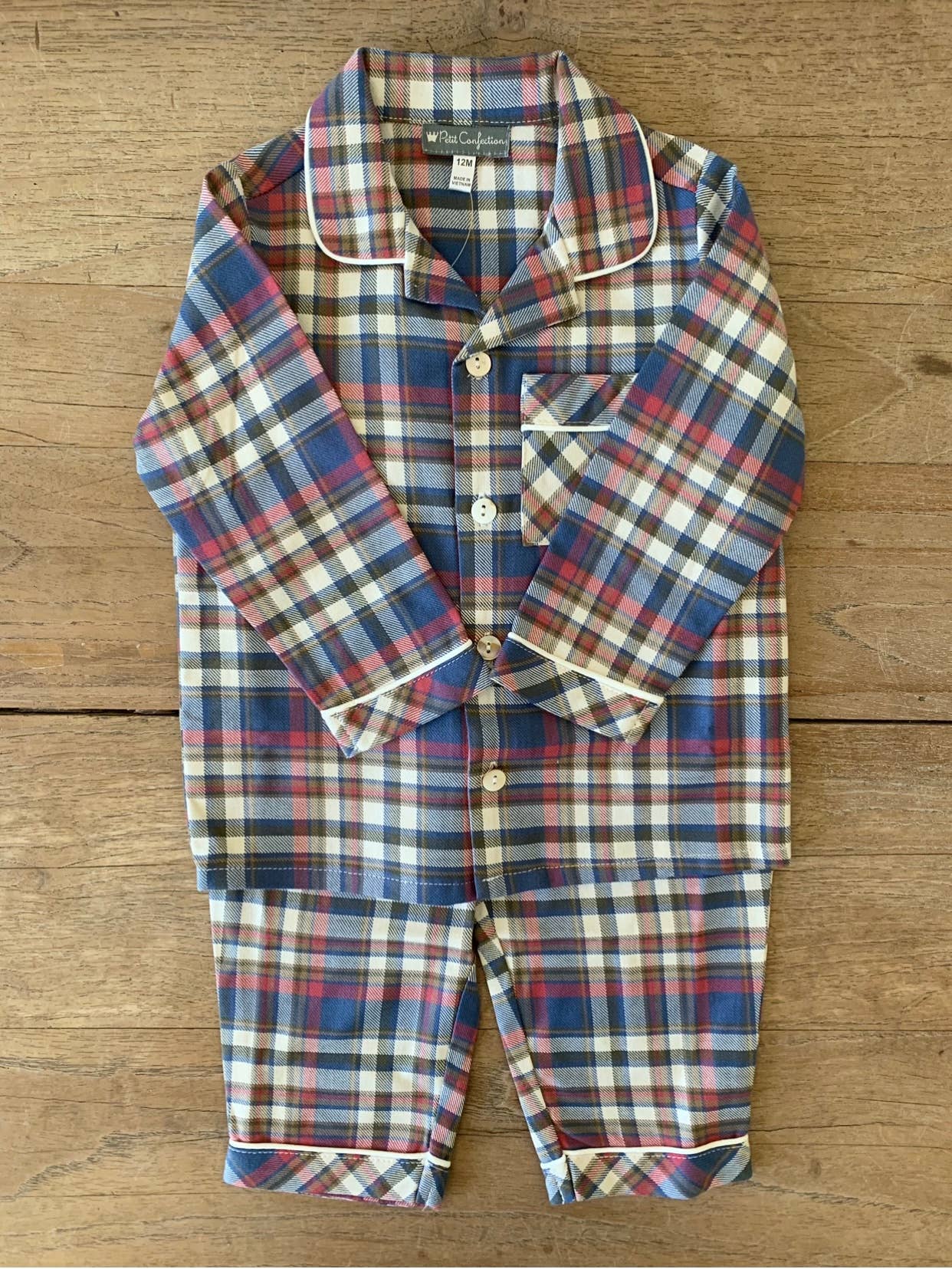 Petit Confection Style : PS105 Un favori des éditeurs, nous sommes séduits par ce pyjama en flanelle pour bébé/tout-petit ! Imprimé à carreaux intégral idéal pour les portraits de vacances. Retardateur de flamme * fermeture par bouton perle *est livré avec un pantalon coordonné