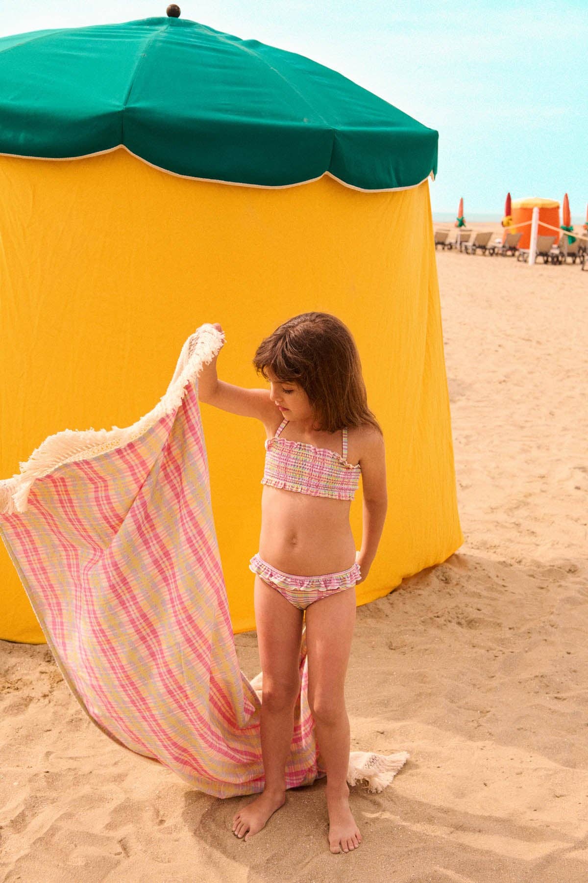 Serviettes en coton colorées, fabriquées à partir de matières premières recyclées. Entièrement réalisées en ITALIE. Motif jacquard avec un dessin géométrique en forme de losanges, franges de couleur naturelle. Produit idéal pour la plage, taille parfaite pour les transats et le bord de mer. Dimensions : 180 cm x 100 cm Poids : 0,4 kg