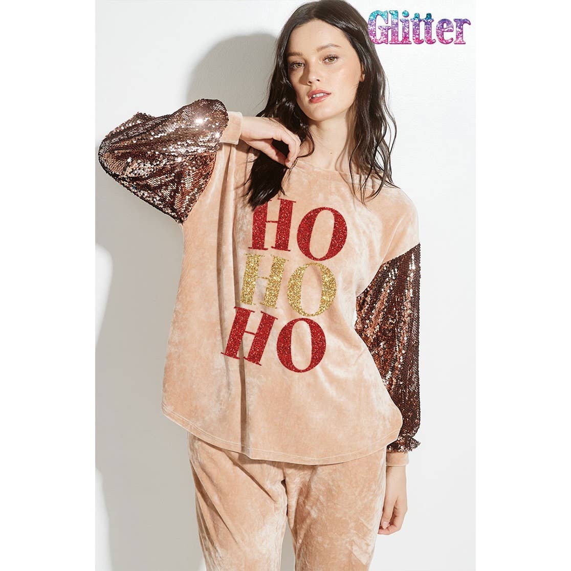 -Ensemble de sweat-shirt en tissu éponge à paillettes -Set assorti -Ensemble supérieur et inférieur -Vêtements de salon de nuit -Tissu doux, style décontracté, à porter au quotidien. -Taille du mannequin : petite (5'10" 31- 23- 34) -Fabriqué aux États-Unis