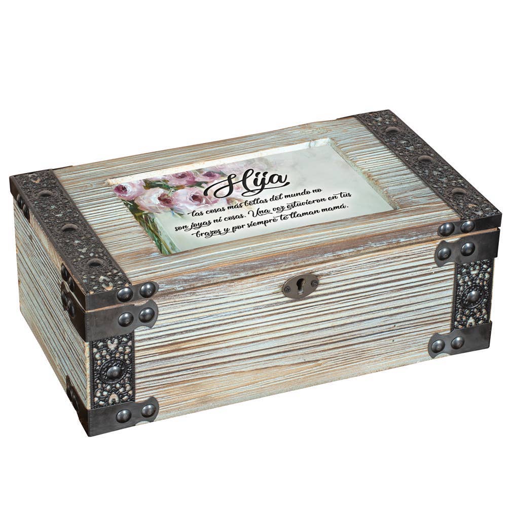 Boîte à musique bijou argentée en finition champagne argenté. Des bijoux en perles encadrent le couvercle articulé. La boîte à bijoux mesure environ 8 x 15,2 x 2,75 cm. L'ouverture de la fenêtre peut contenir une photo personnelle de 10,2 x 15,2 cm. Intérieur doublé en velours noir ; les pieds décoratifs sont rembourrés pour protéger les surfaces de table et d'étagère. Livré dans une boîte individuelle. Boîte à musique à remonter sur les ailes d'aigle.