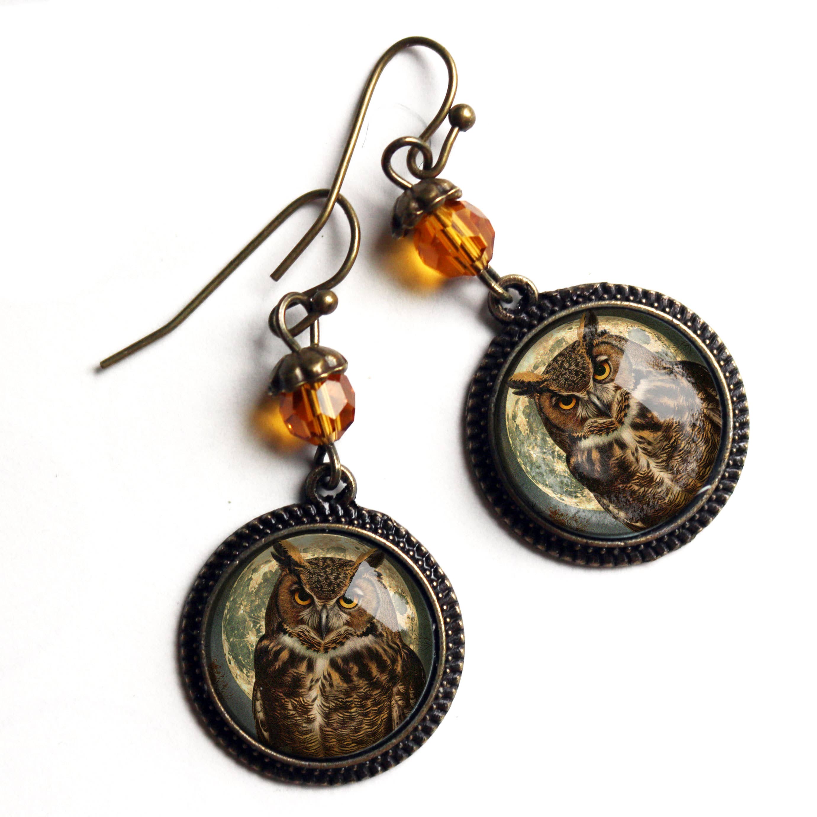 Boucles d'oreilles cabochon en bronze et verre Victorian Owl