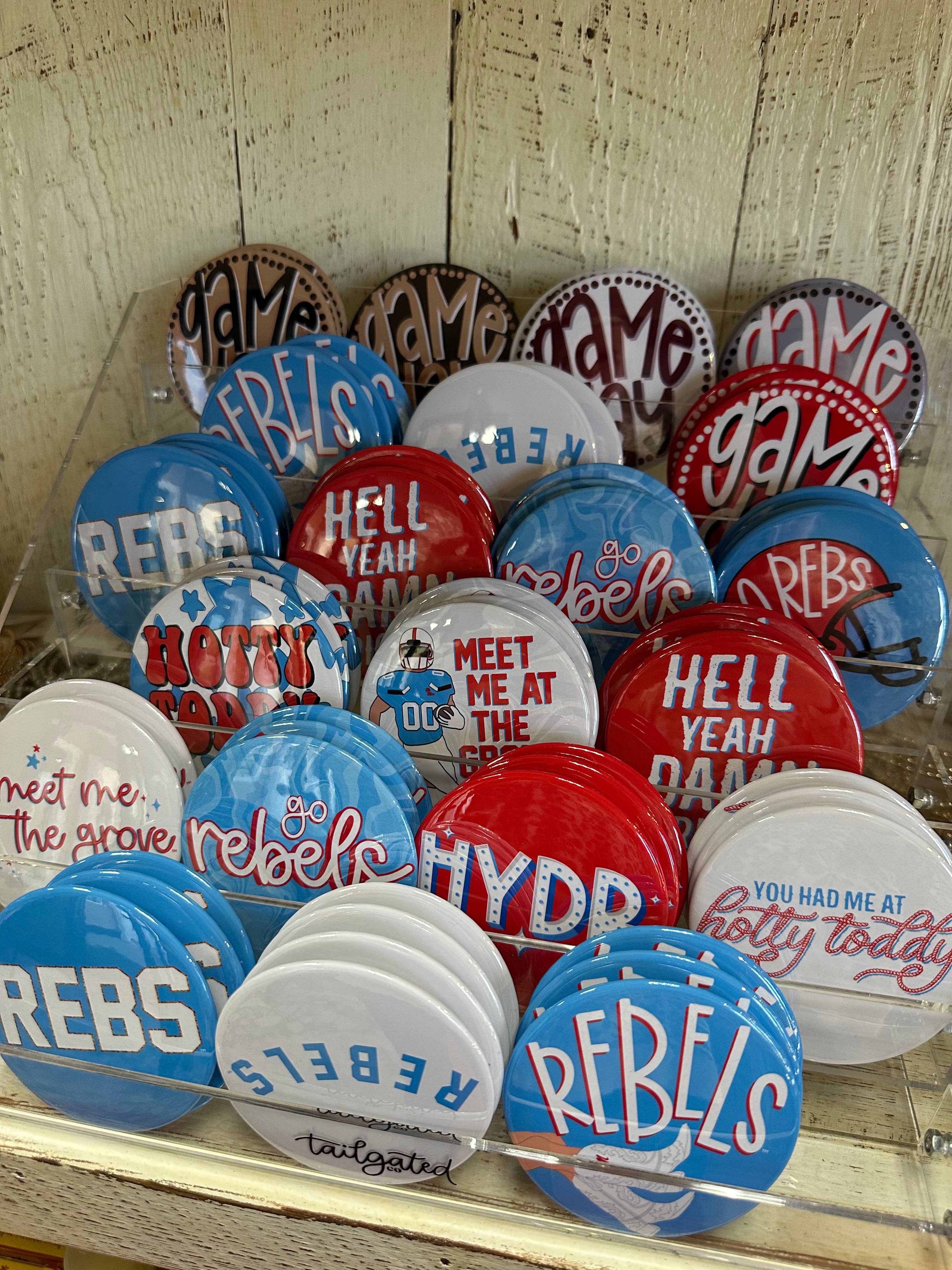 Boutons Ole Miss Game Day | Épinglettes Gameday | Université du Mississippi en vente B2B