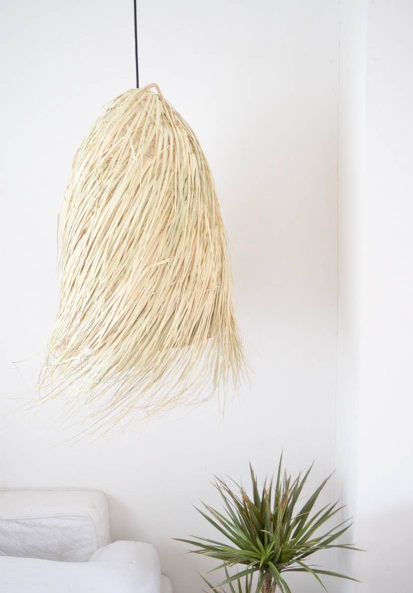 Lot de 2 suspensions artisanales en raphia de palmier, tissées à la main. Ces luminaires tendance, bordés de franges de palmier effiloché, offrent un look bohème unique. Leur couleur naturelle de paille évoque une atmosphère tropicale et ensoleillée, rappelant les plages exotiques. L’éclairage marocain est actuellement très en vogue dans le design intérieur et les magazines spécialisés. Abat-jour conique suspendu en rotin naturel et raphia de palmier, entièrement frangé. Diamètre du pendentif : 30 cm / Hauteur : 45 cm Matériau : rotin naturel et raphia de palmier Vendu par lot de 2.