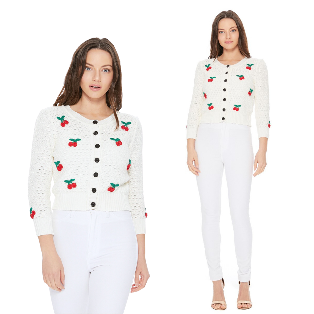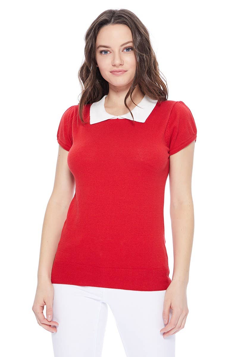 - Chandail ajusté en tricot de 23 à 24 pouces, manches courtes, bordure côtelée. - Coupe ajustée, joli col contrastant, pull doux. - Double grammage en jacquard 12 g/m², style féminin, look intemporel. - Manches bouffantes, joli motif à pois.