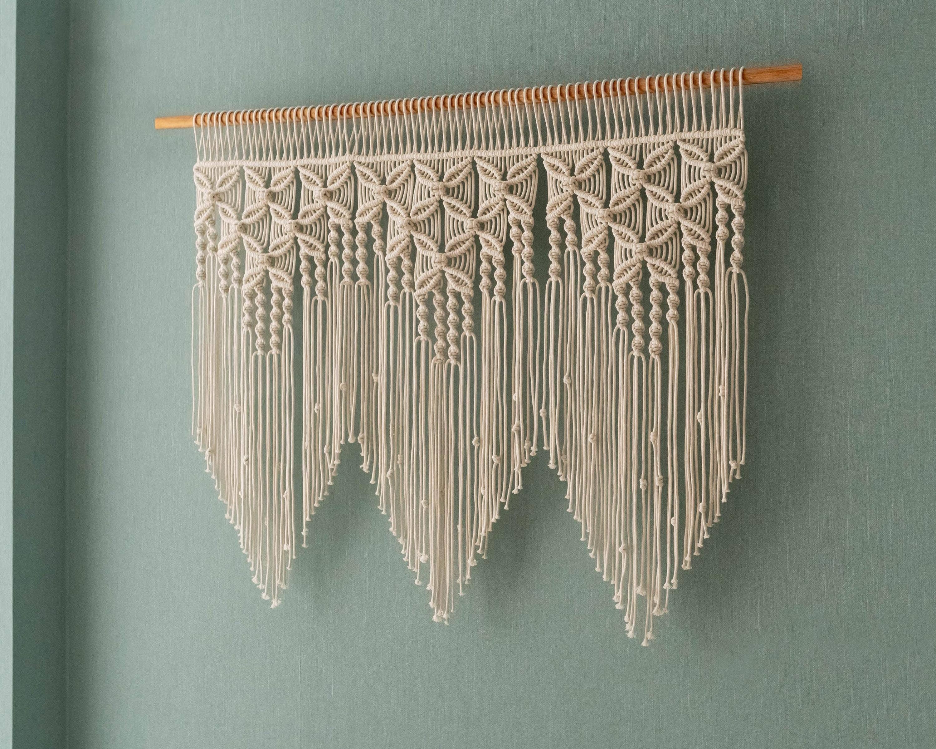 Transformez votre espace avec ce charmant rideau en macramé, parfait comme œuvre d'art murale moderne ou comme rideau de porte. Idéale pour ajouter une touche d'élégance à n'importe quelle décoration de fenêtre en macramé, cette tapisserie bohème constitue également un délicieux cadeau de pendaison de crémaillère. Admirez le charme d'une ferme avec une cantonnière de chambre unique ou une pépinière forestière en toile de fond. Ce rideau en macramé est fabriqué à la main/tissé à la main avec un cordon en pur coton naturel. DÉTAIL : - Couleur : couleur par défaut : naturelle (Veuillez noter votre couleur préférée dans la zone de personnalisation. Sinon, la couleur par défaut sera appliquée) REMARQUE : - Les formes et les motifs varient légèrement selon les options de largeur. - La tenture murale ne comprend pas de cheville en bois ni de bois flotté. - Vous pouvez facilement acheter une cheville en bois dans votre région ou la suspendre comme rideau sans cheville en bois. - Pour une taille personnalisée, veuillez nous envoyer un message. - Pour un meilleur tarif avec un volume élevé, veuillez nous contacter. - La taille peut varier légèrement en raison de la nature des produits fabriqués à la main individuellement.