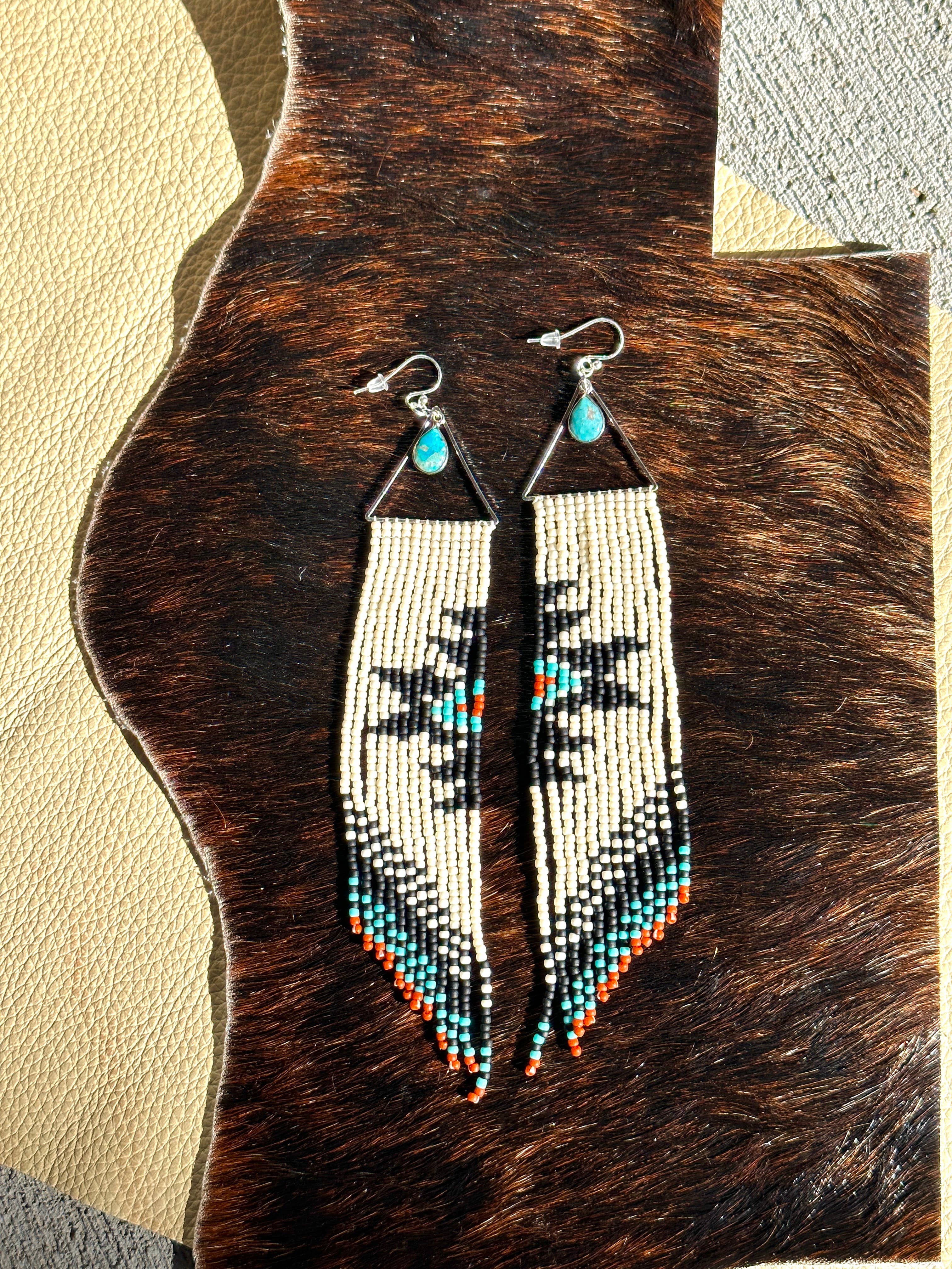 Illuminez votre journée avec ces boucles d’oreilles à franges vibrantes d’inspiration sud-ouest. Elles attirent tous les regards. Conçues d’après les motifs colorés traditionnels du serape occidental, que l’on retrouve sur les couvertures amérindiennes. J’aime la légèreté des franges qui flottent au moindre mouvement naturel. Parfaites à porter avec un jean et mes bottes préférées ! Longueur totale : 14 cm Largeur : 3,8 cm *Fabriquées avec des perles en verre Miyuki 11/0 de haute qualité. Crochets d’oreilles en argent sterling.
