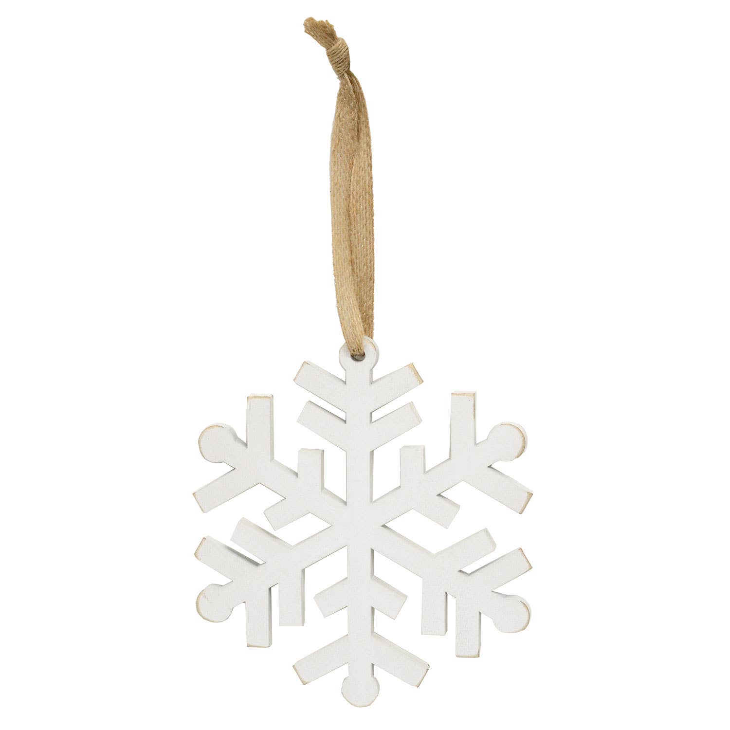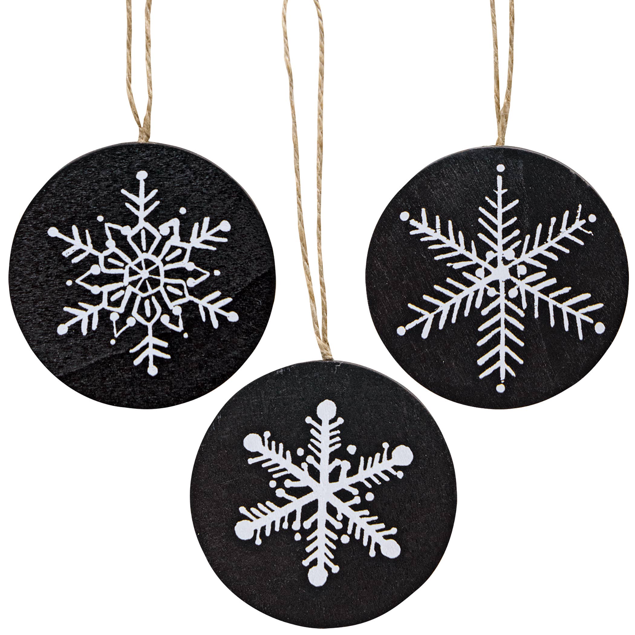 Les ornements en forme de flocon de neige sont fabriqués à partir de bois naturel découpé au laser dans quatre styles différents. Il y en a 6 de chaque style pour un total de 24 ornements. Ils ont un diamètre de 2 ¼ pouces et sont munis d'un cordon en coton.