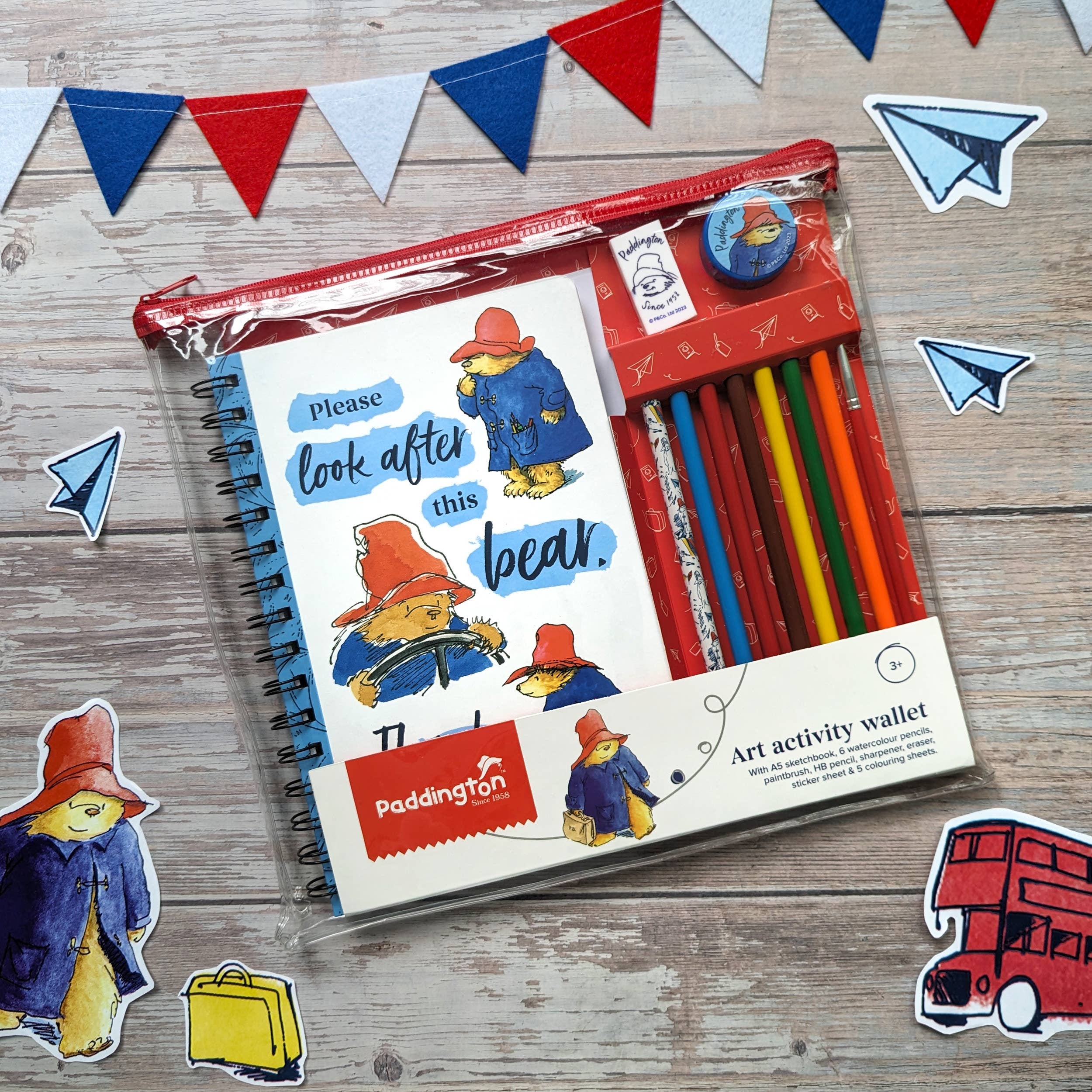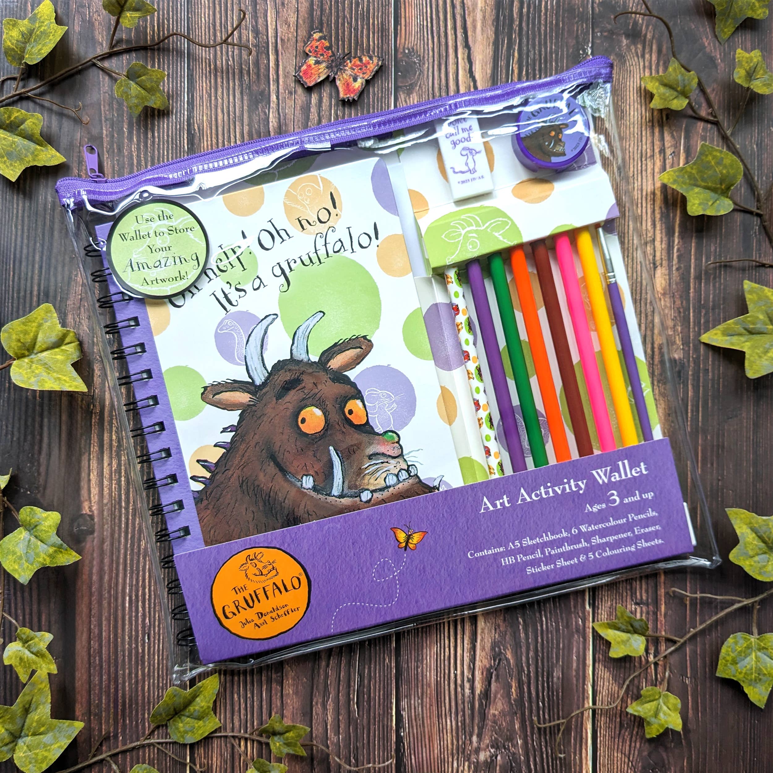 L'ensemble comprend : un carnet de croquis A5, 6 crayons d'aquarelle, un pinceau, un crayon HB, un taille-crayon, une gomme, une feuille d'autocollants et 5 feuilles à colorier. Comprend un portefeuille zippé réutilisable très pratique pour tout ranger.