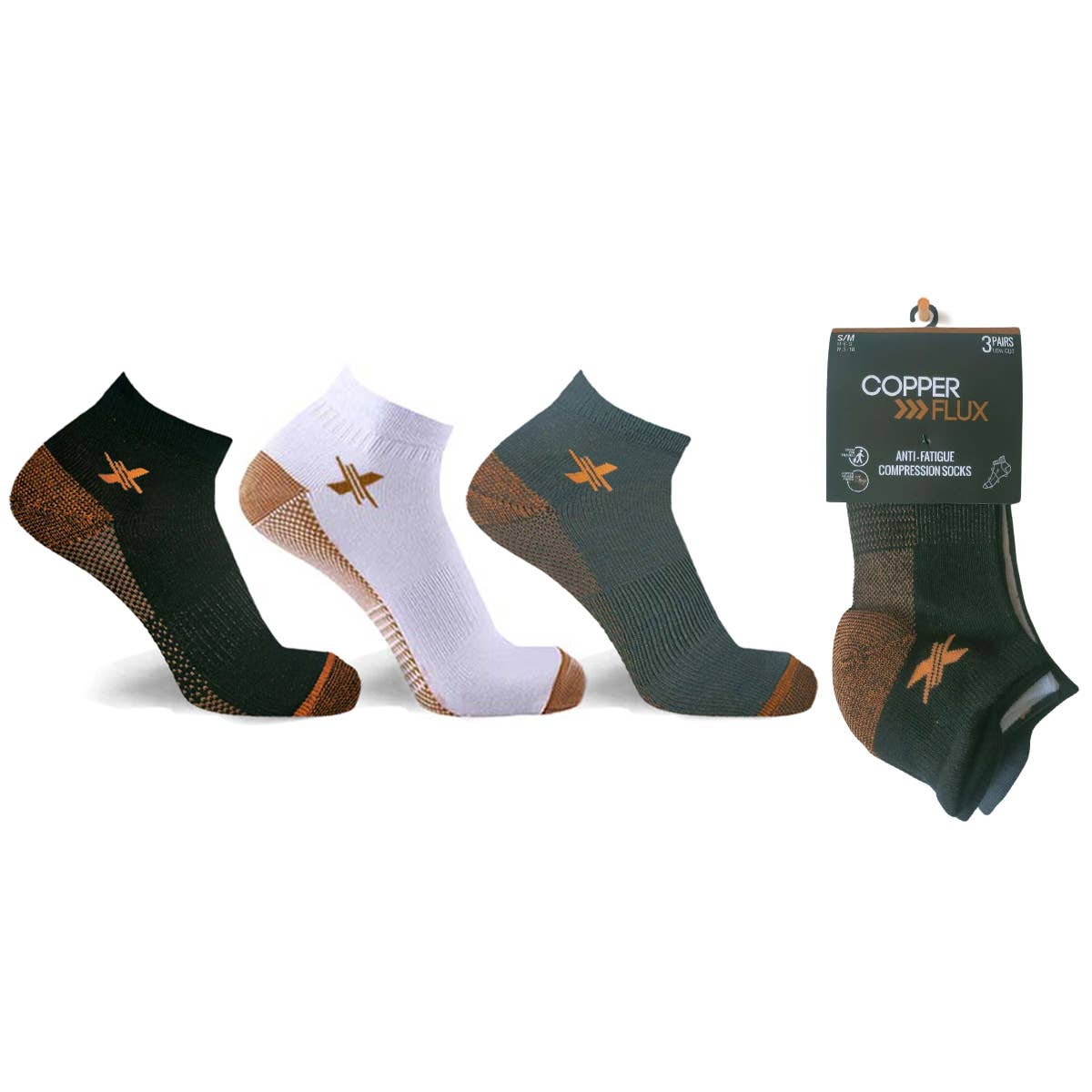 La technologie de compression vise à réduire l'enflure et à améliorer la circulation sanguine. Propriétés antimicrobiennes conçues pour éliminer les mauvaises odeurs et les infections fongiques. Le matériau respirant réduit l'humidité pour aider à garder les pieds au frais et à l'aise. Parfait pour ceux qui restent debout toute la journée ! Peut être accroché individuellement et doté d'un code-barres Niveau de compression : 15-20 mmHg Dimensionnement Petit et moyen : 6 à 9 ans pour hommes et 5 à 10 ans pour femmes Large/XL : hommes de 9 à 12 ans et femmes de 10 à 12 ans