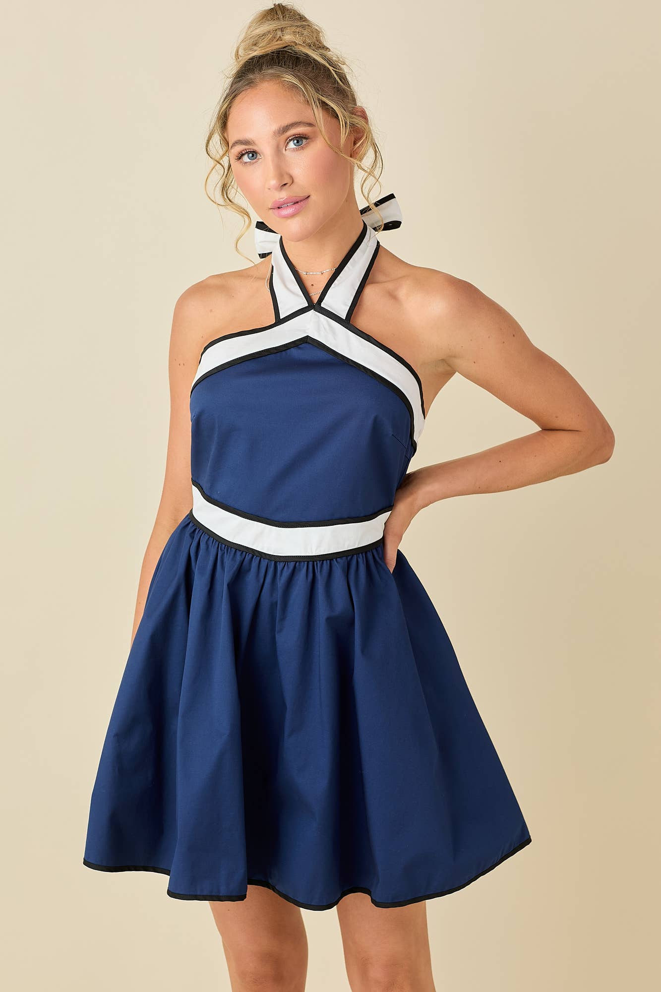 - Robe mini à bretelles avec encolure en cœur - Tissu brodé - Fermeture éclair cachée sur le côté - Fronces au dos - Détail de bordure contrastante sur le bas de la jupe - Entièrement doublée L'encolure en cœur et les fines bretelles mettent en valeur le corsage ajusté, soulignant la beauté de la poitrine et des épaules. Une ceinture en coton brodé accentue la taille la plus fine avant de s'ouvrir sur une jolie jupe évasée. C'est la « Petite robe d'été » indispensable dans votre valise. - Mesures du mannequin : Taille : 1,73 m (5'8") Tour de poitrine : 81 cm (32") Tour de taille : 69 cm (27") Tour de hanches : 91 cm (36") Le mannequin porte une taille Small.