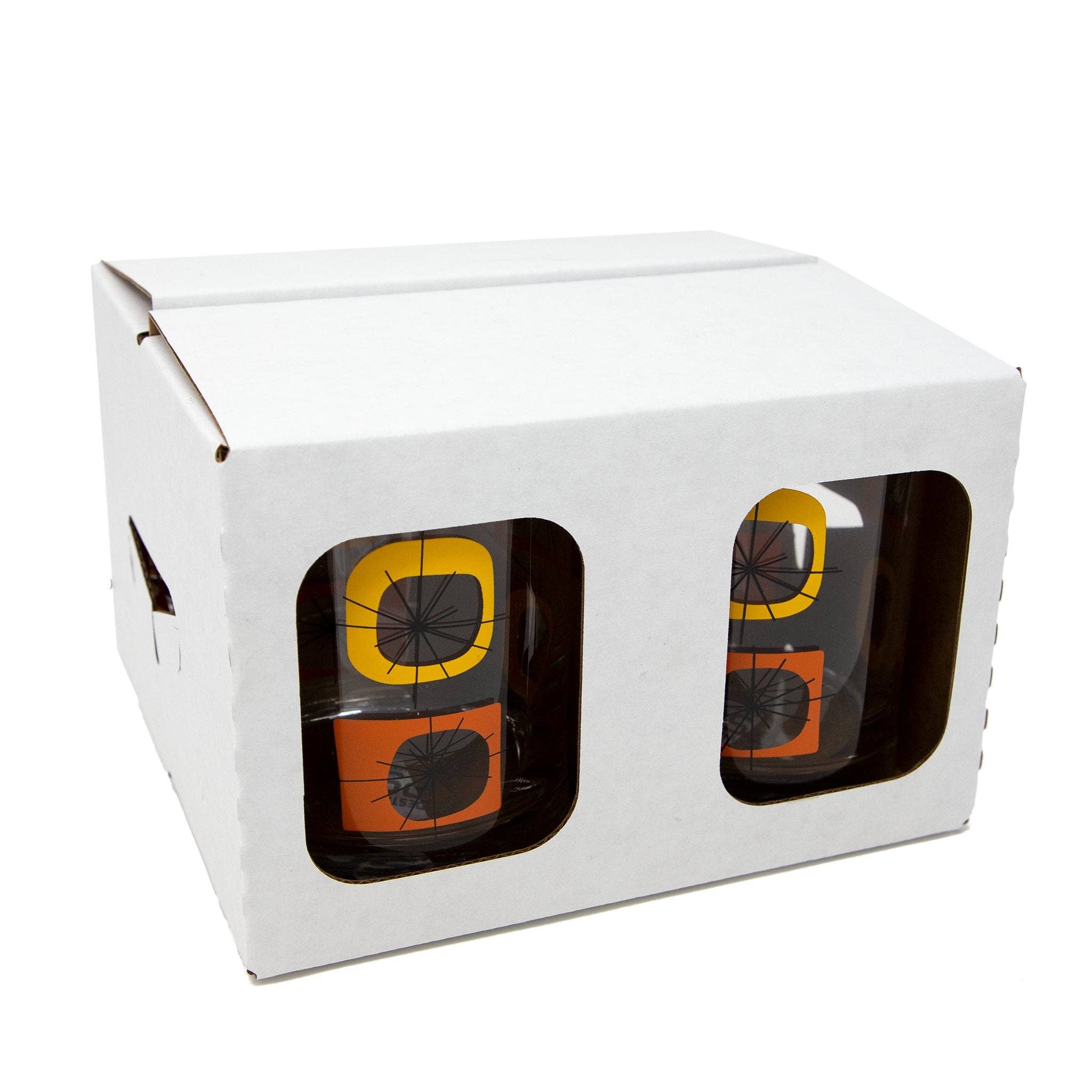 Ces verres à cocktail old fashioned classiques de 414 ml (14 oz) présentent les motifs atomiques d'inspiration mi-siècle originaux de Destination PSP, en bleu/vert ou orange/jaune. Le coffret contient 4 verres, soit tous bleu/vert, tous orange/jaune, ou 2 de chaque. Chaque verre mesure 11,4 cm (4 1/2 pouces) de haut sur 8,6 cm (3 3/8 pouces) de diamètre, et contient 414 ml (14 oz). Fabriqués en verre, ces modèles diffèrent des gobelets Atomic Acrylic en acrylique, qui partagent le même design. Fabriqué et décoré aux États-Unis. Le lavage à la main est recommandé.