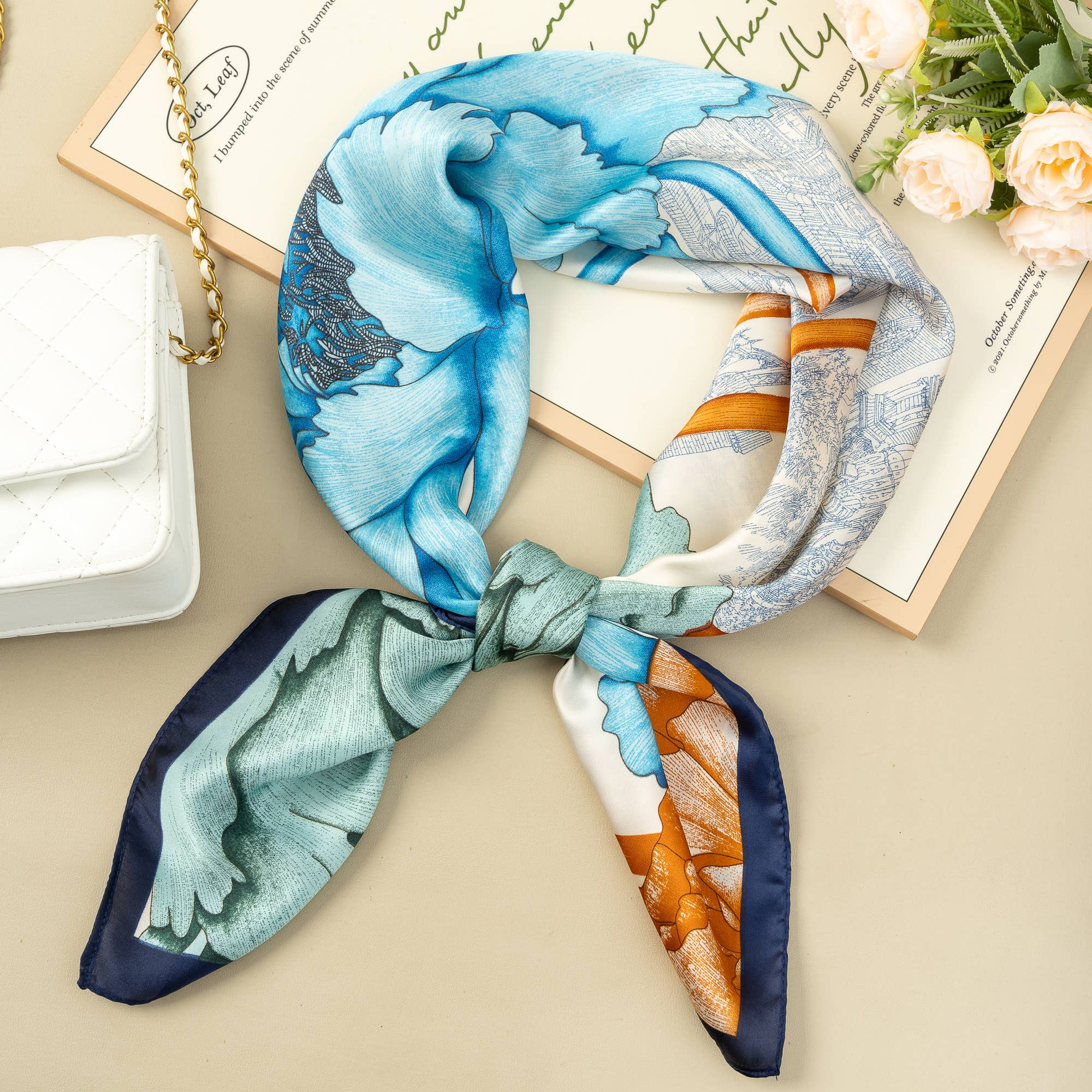 Ce foulard carré 70x70 cm en polyester effet soie séduit par son motif floral éclatant, mêlant roses orange et jaunes sur fond bleu nuit et vert émeraude. Sa bordure orange souligne son caractère vibrant et féminin. Léger, doux et lumineux, il se noue au cou, au sac ou dans les cheveux pour un style chic et coloré. Parfait comme accessoire mode femme, il illumine chaque tenue avec poésie et élégance. Un foulard floral à porter toute l’année. 100% Polyester